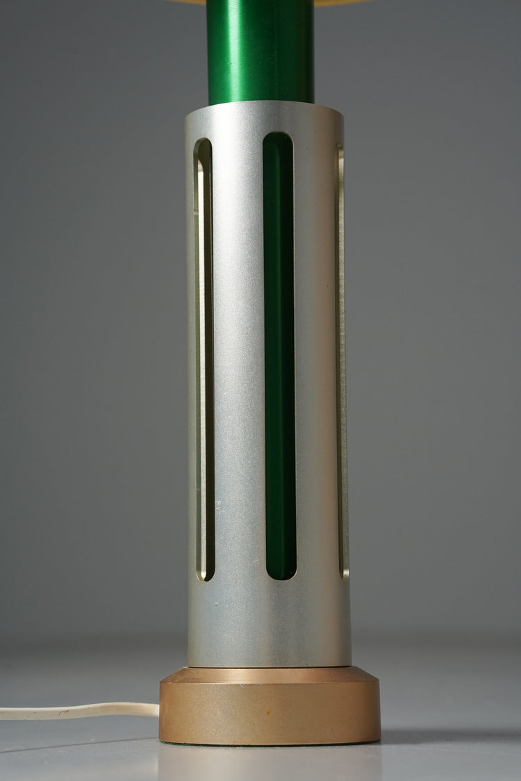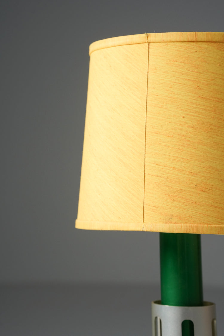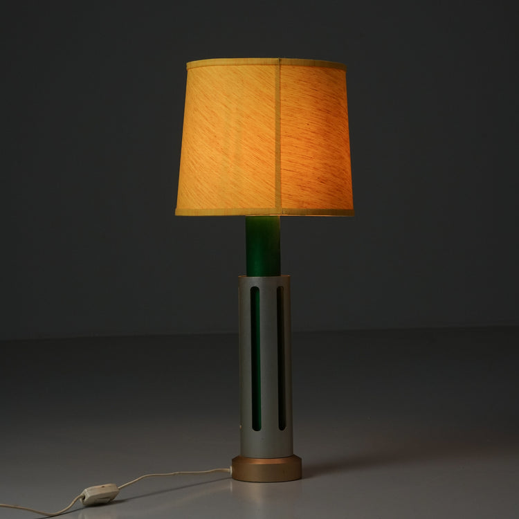Pöytävalaisin, 70-luku. Runko maalattua metallia. Kangasvarjostin. Hyvä kunto, ajan patinaa.