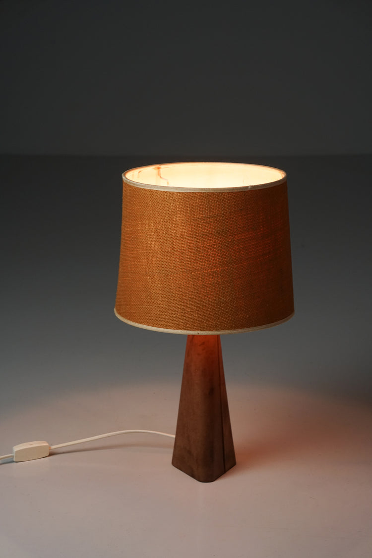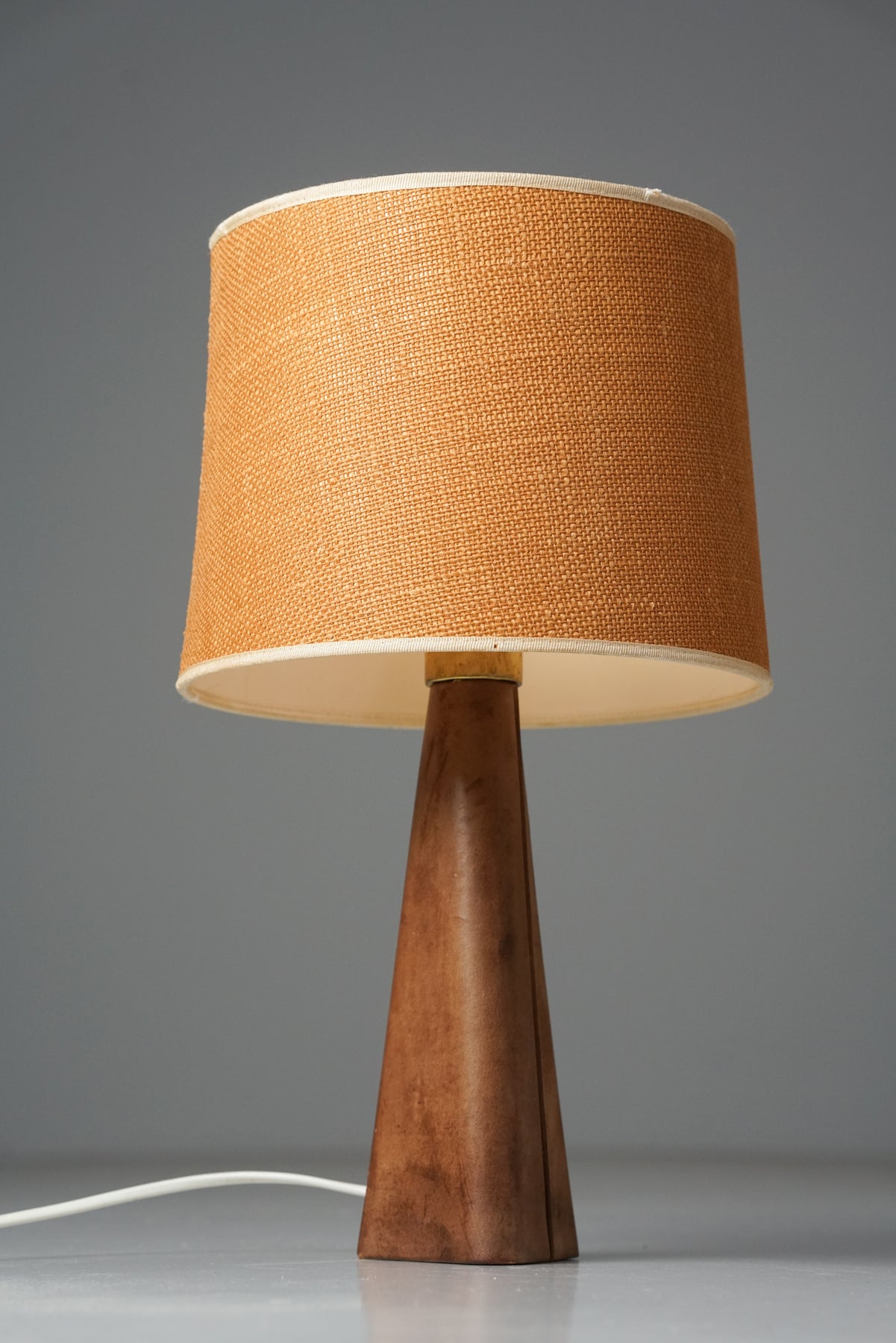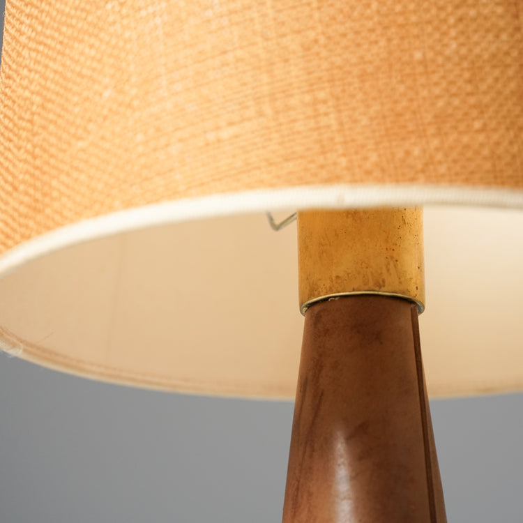 Pöytävalaisin malli 46-017, design Lisa Johansson-Pape, valmistanut Stockmann/Orno, 60-luku. Runko nahkaa ja messinkiä, kangasvarjostin. Leimattu. Hyvä kunto, ajan patinaa.