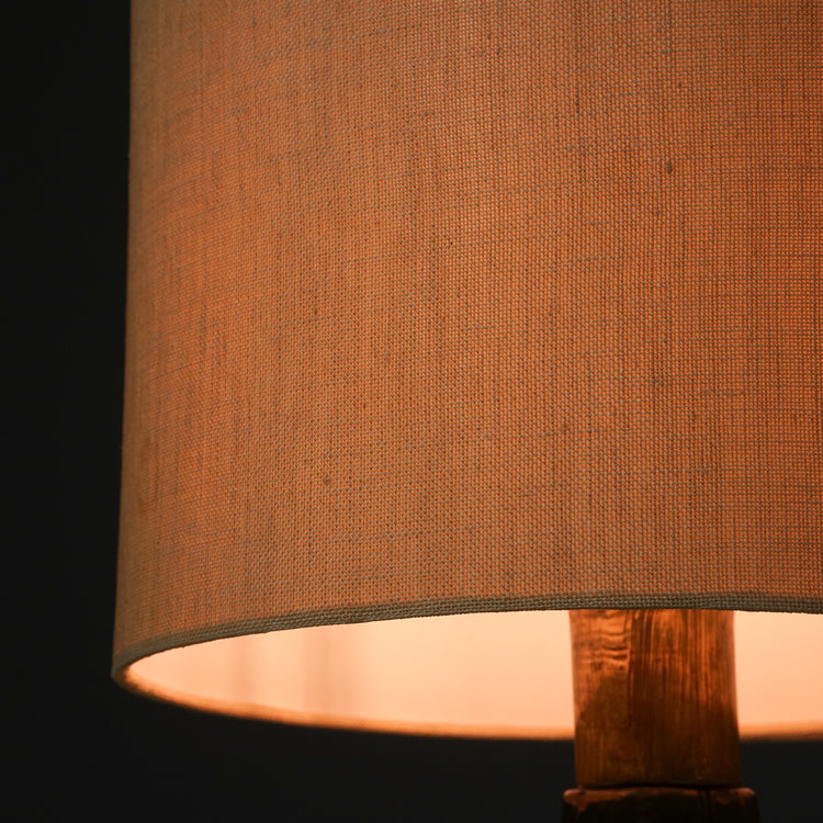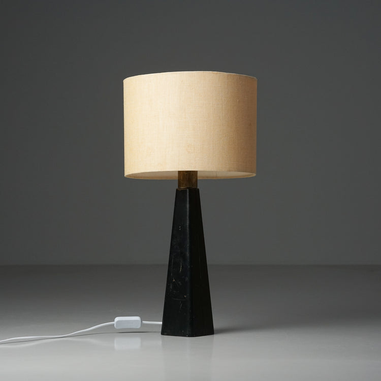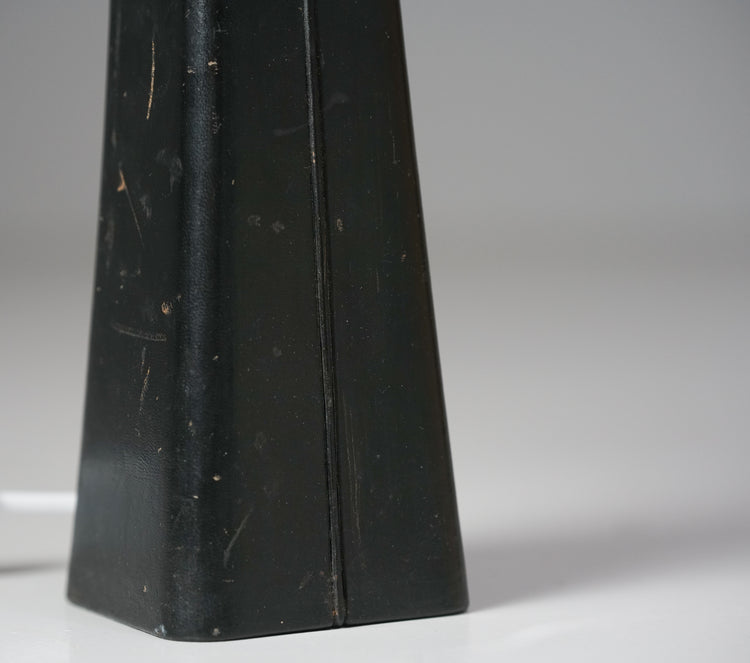 Pöytävalaisin malli 46-017, design Lisa Johansson-Pape, valmistanut Stockmann/Orno, 60-luku. Runko nahkaa ja messinkiä. Kangasvarjostin. Leimattu. Hyvä kunto, ajan patinaa.