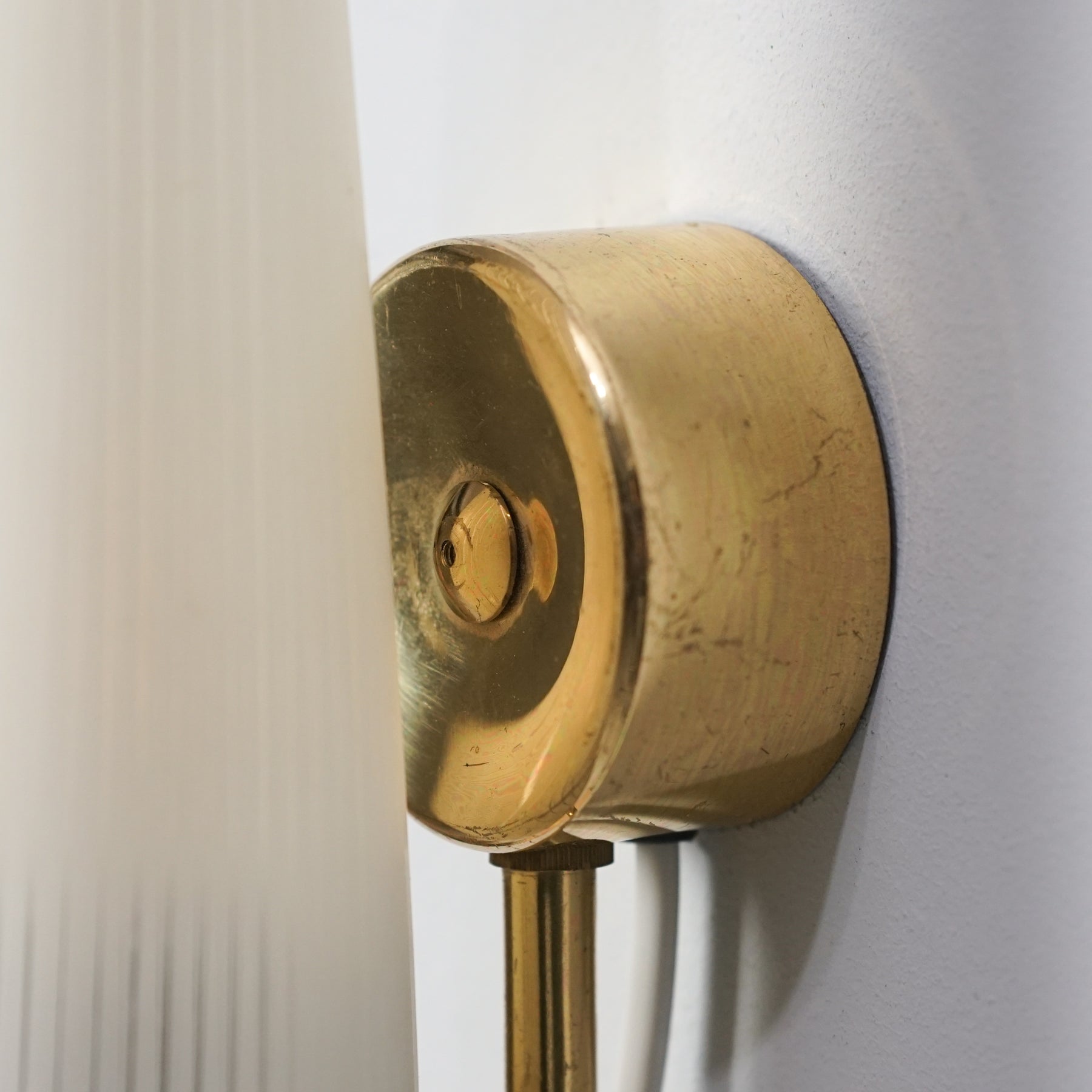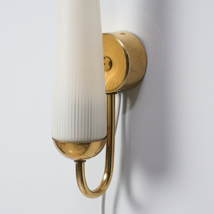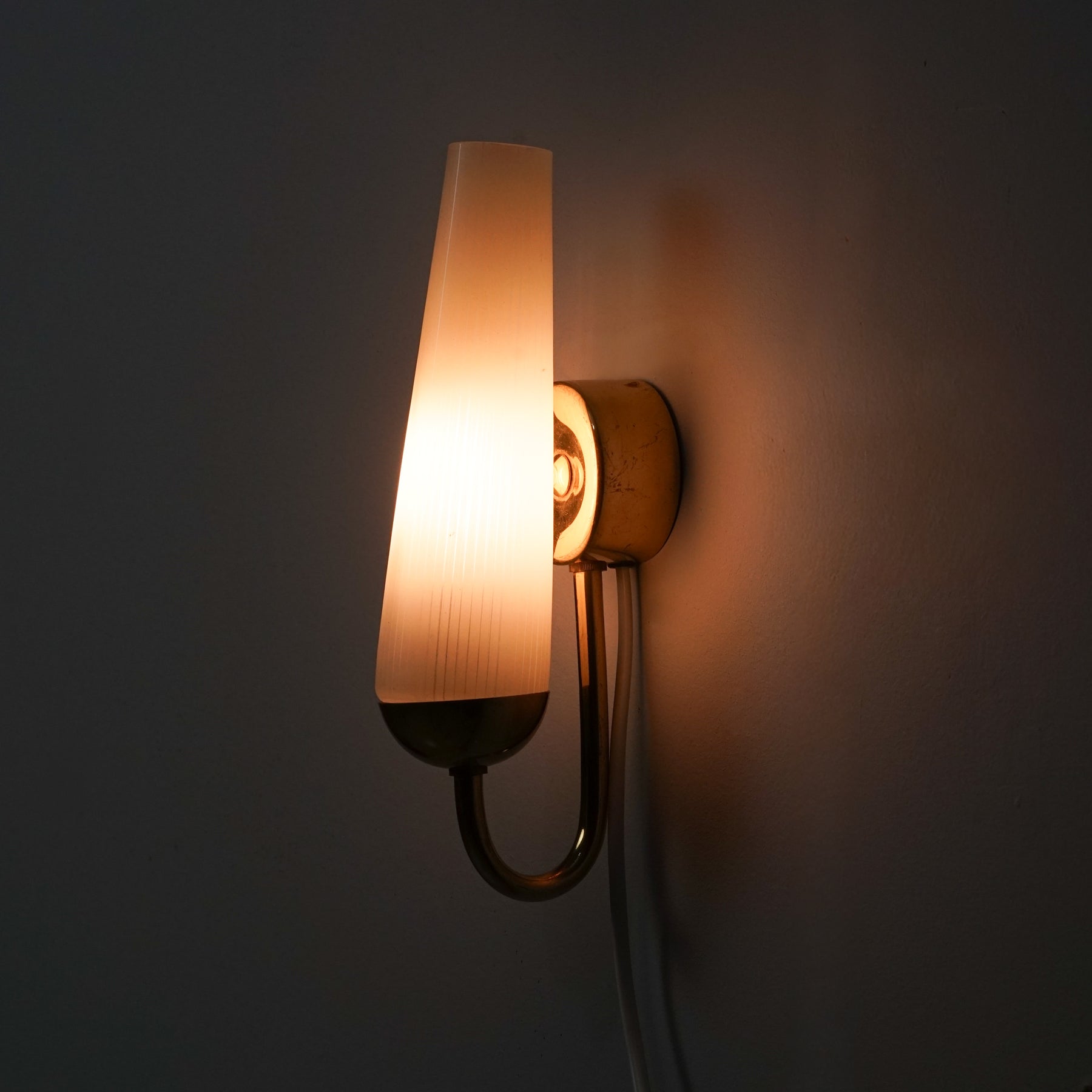 Seinävalaisin (5 kpl myydään erikseen), valmistettu Suomessa, 50-luku.  Runko messinkiä, varjostin värillistä lasia. Hyvä kunto, pientä ajan patinaa. Valaisimet myydään erikseen. Ilmoitettu hinta on kappalehinta.