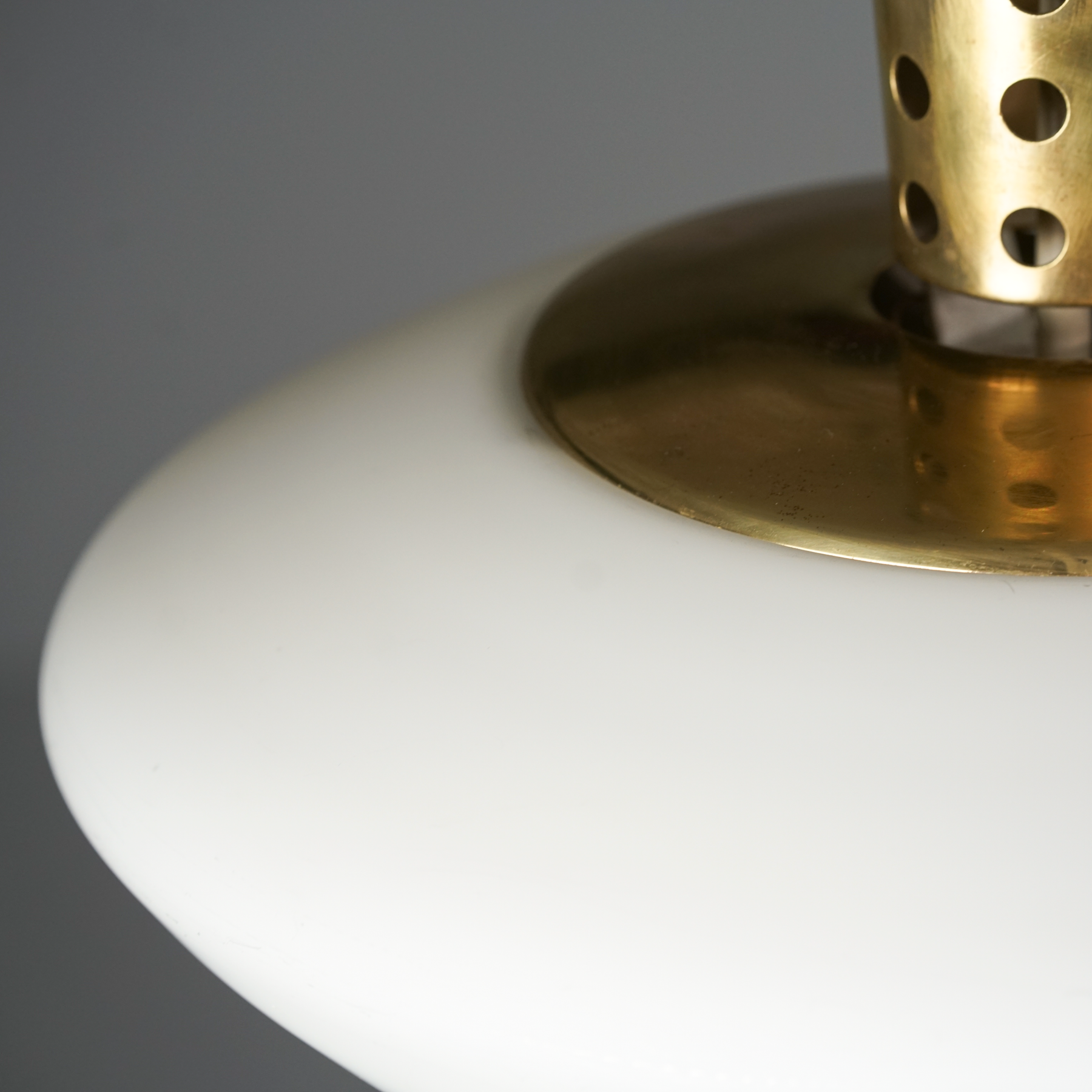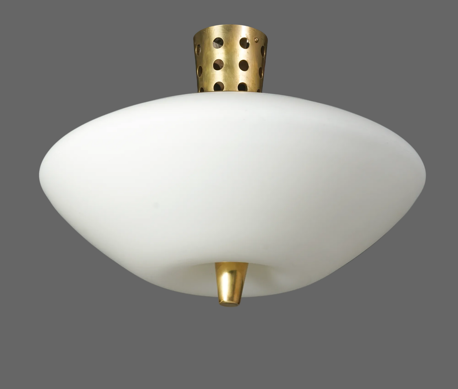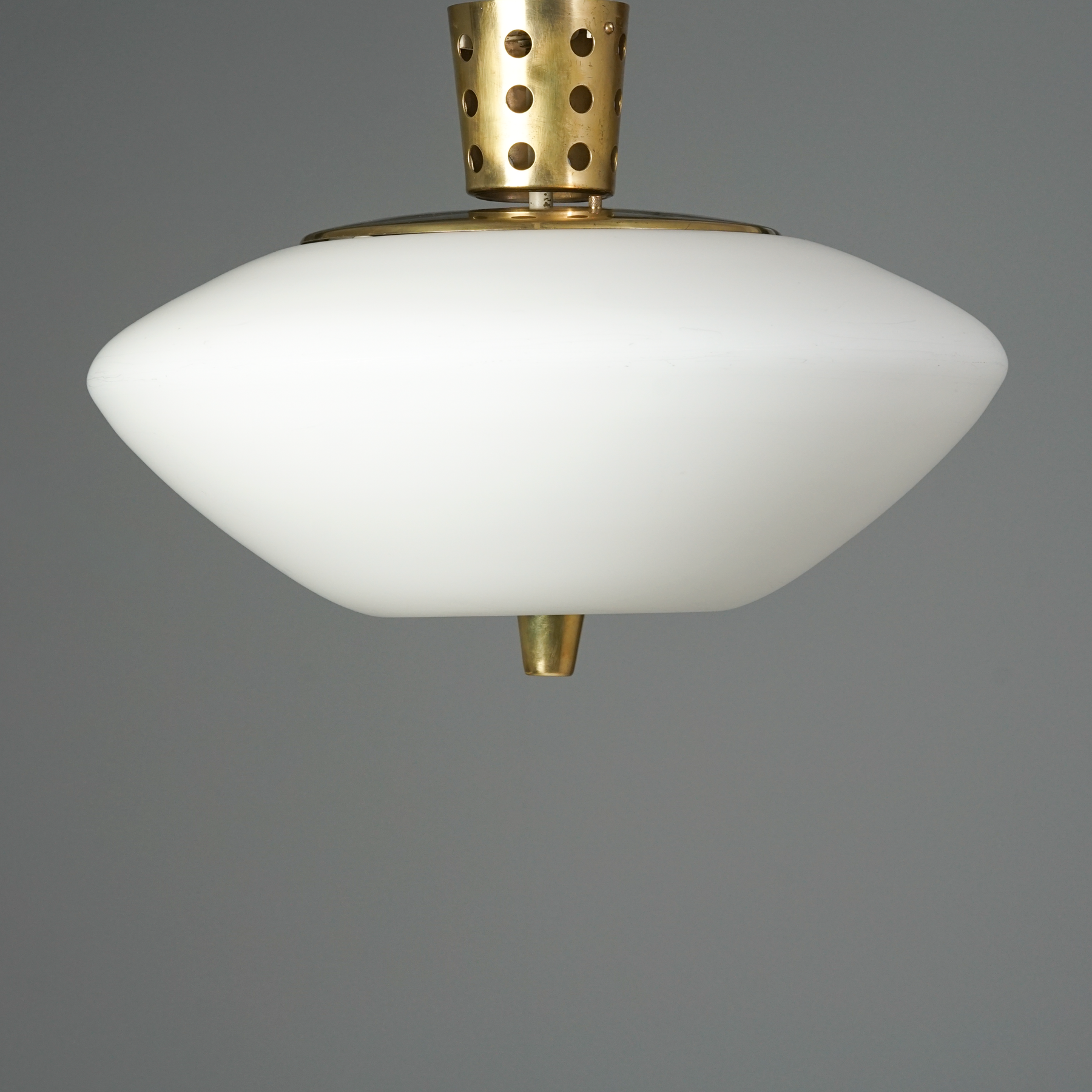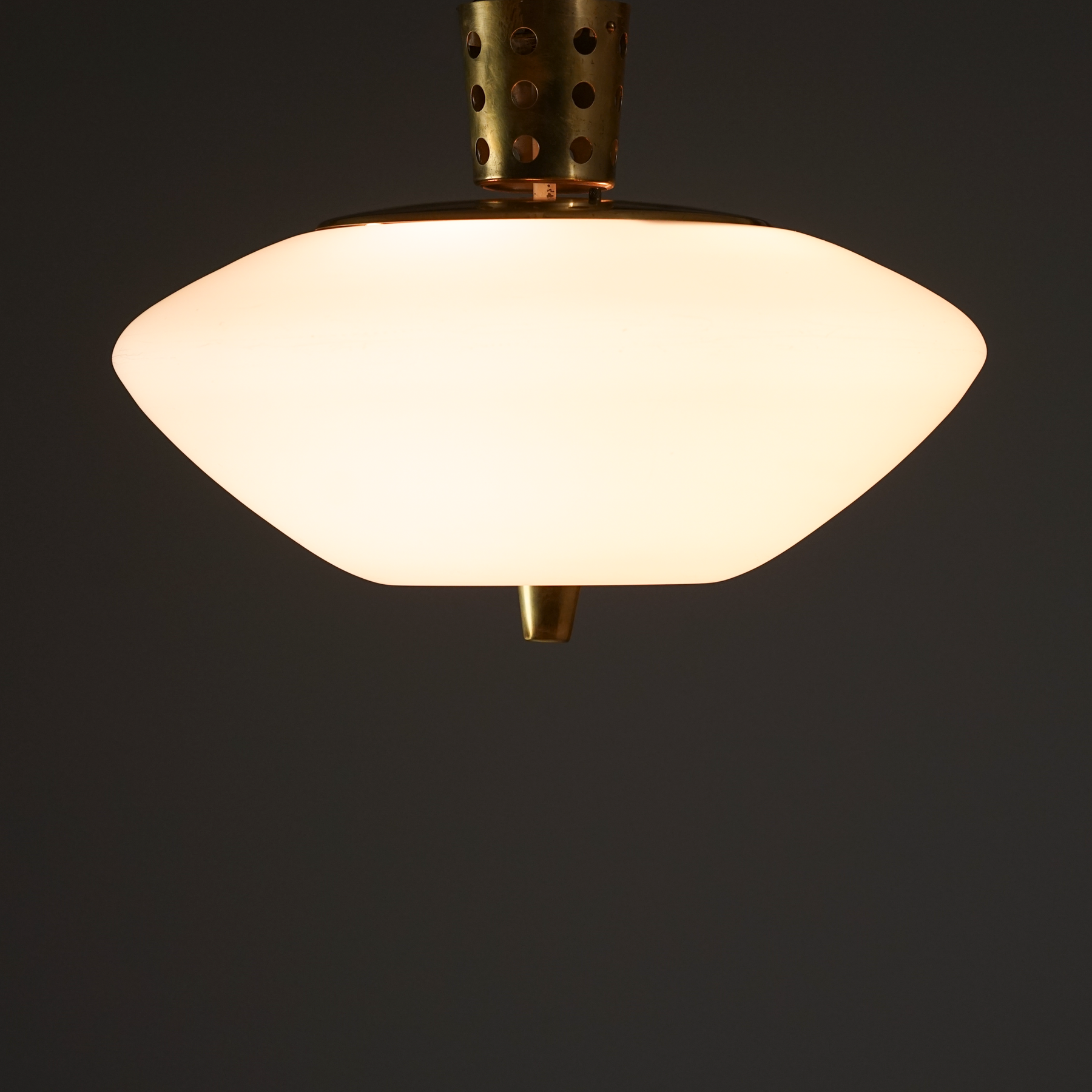 Plafondi malli 71-125, design Lisa Johansson-Pape, valmistanut Stockmann-Orno, 50-luku. Messinkiä ja opaalilasia. Leimattu. Hyvä kunto, pientä ajan patinaa.
