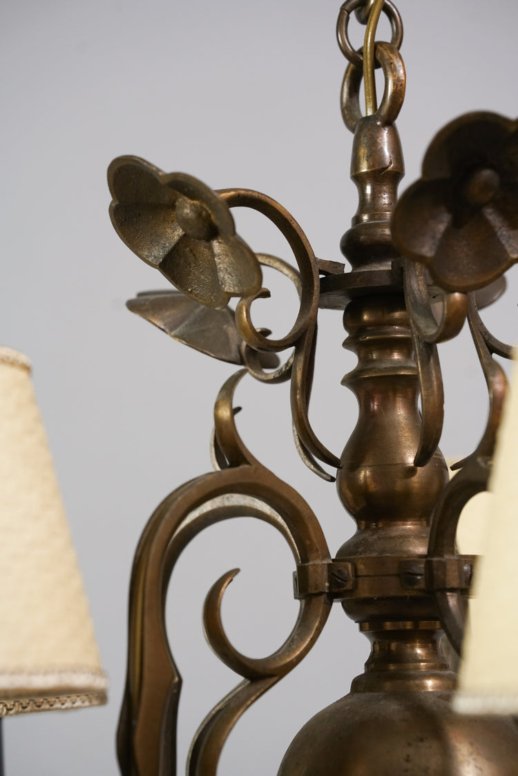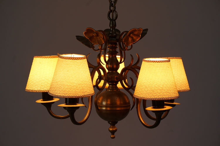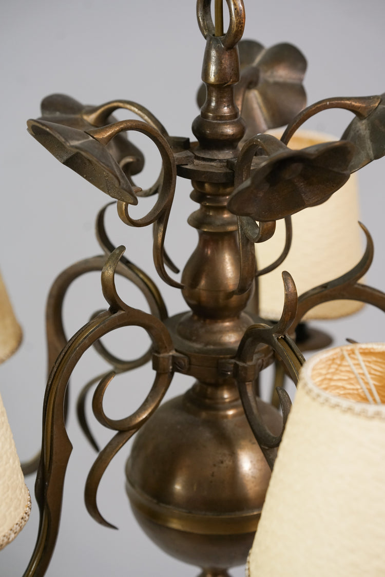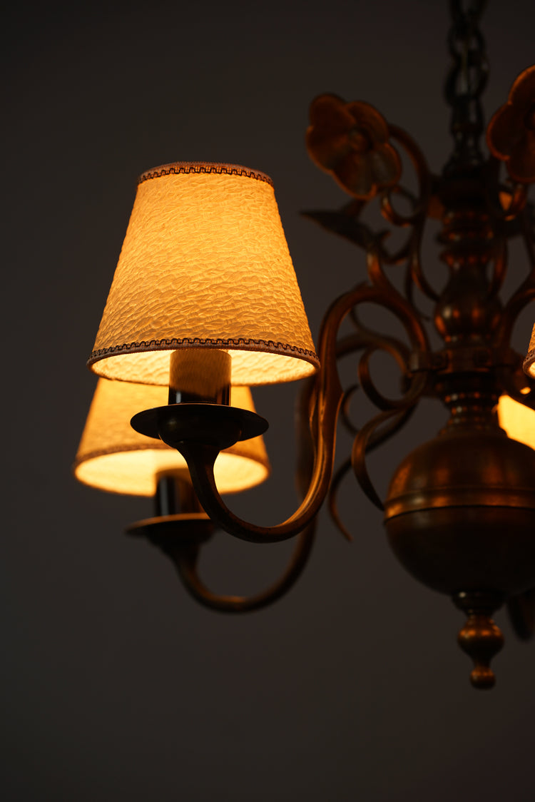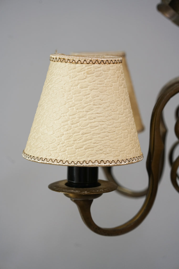 Harvinainen messinkinen kattokruunu malli 50488, design Paavo Tynell, Taito Oy, 20/30-luku. Lampunvarjostimet paperia. Hyvä kunto, pientä ajan patinaa.