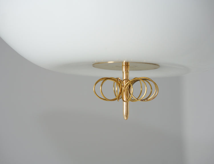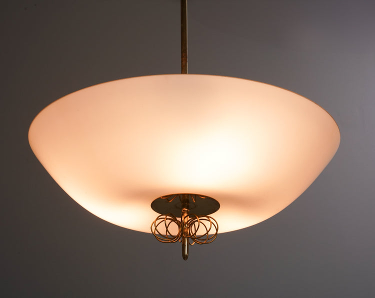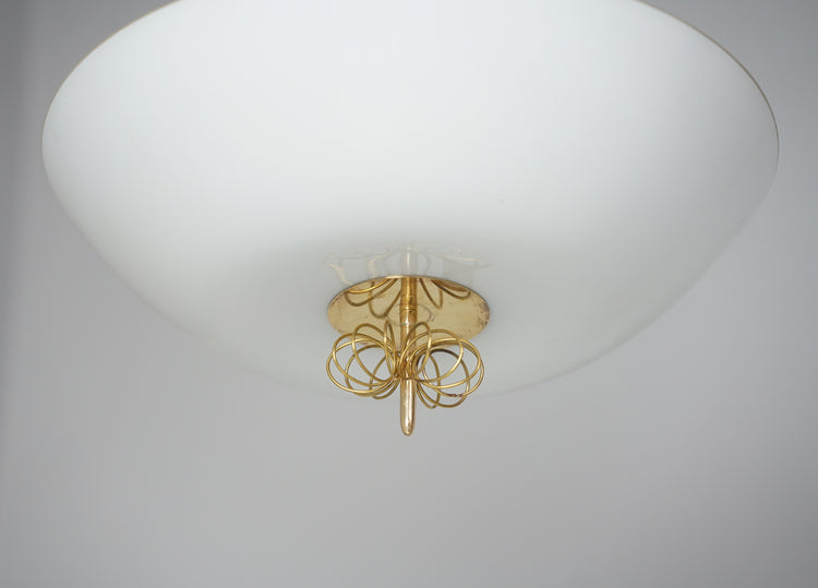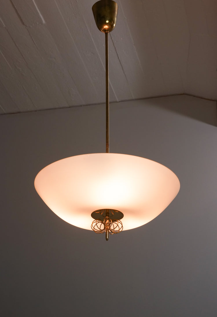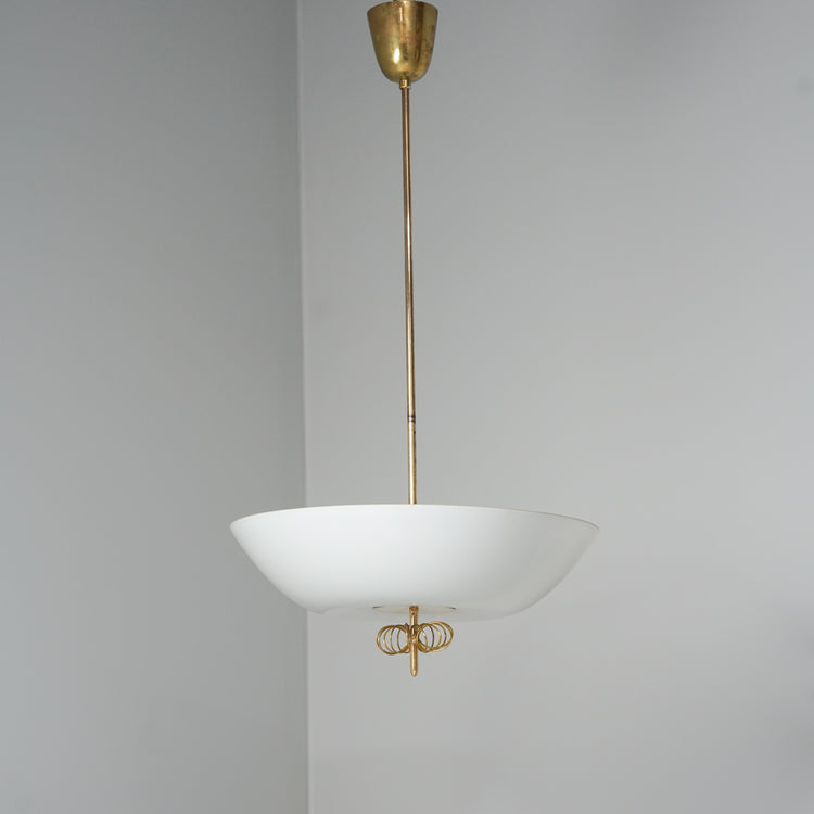 Kattovalaisin malli 1088, design Paavo Tynell, valmistanut Taito Oy, 40-luku. Opaalilasi kupu, runko sekä yksityiskohdat messinkiä. Hyvä kunto, pientä ajan patinaa.