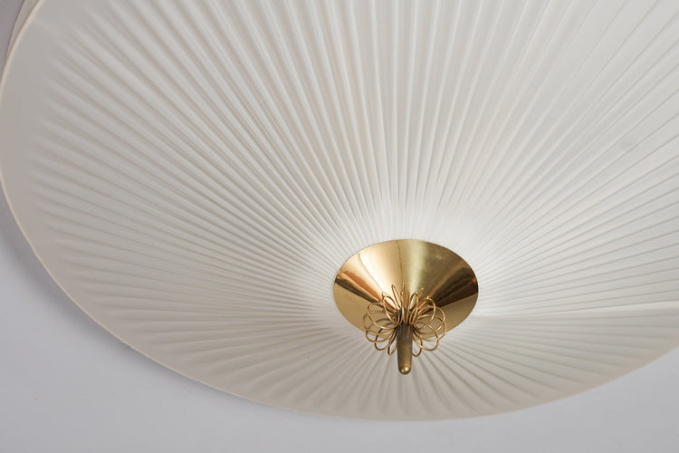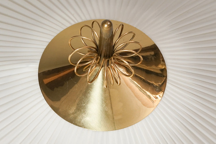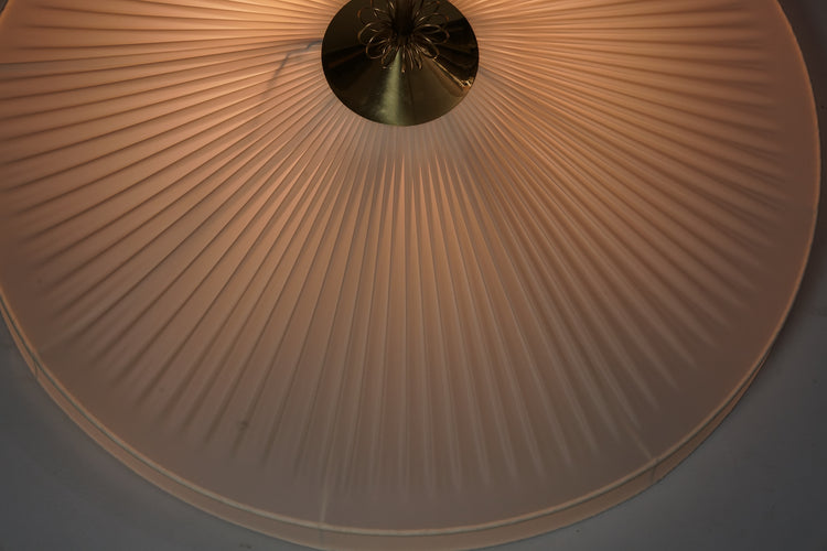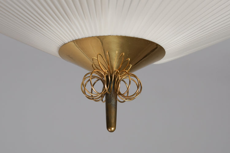 Plafondi, valmistettu Suomessa, 50-luku, messinki yksityiskohdat, muovi varjostin. Hyvä kunto, pientä ajan patinaa ja jälkeä.
