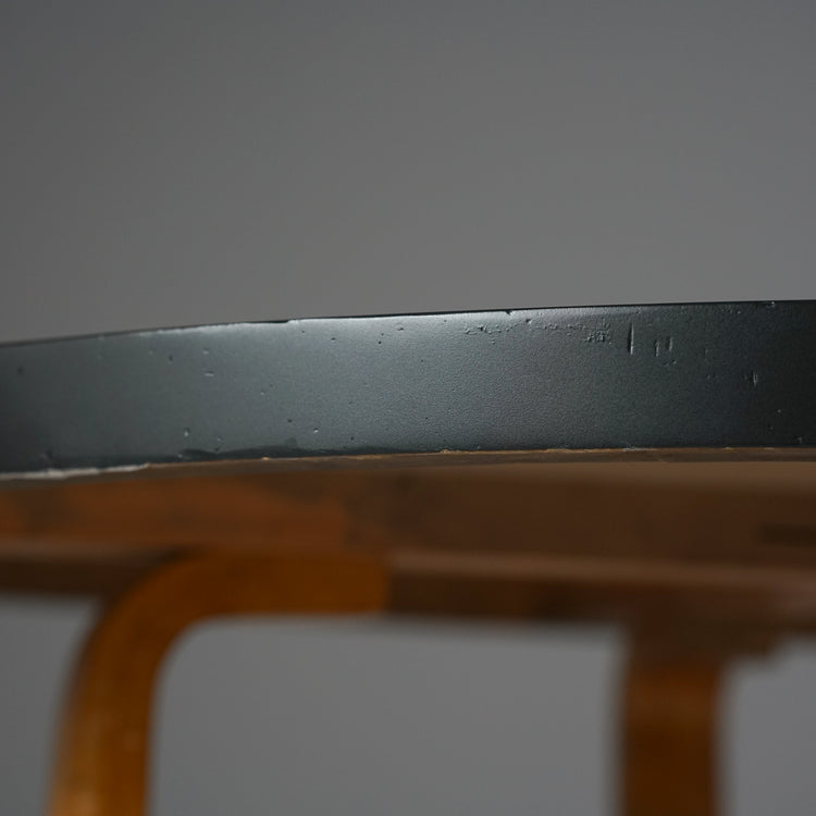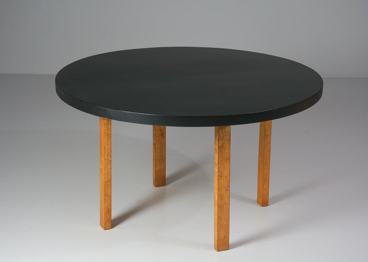Pyöreä ruokapöytä, design Alvar Aalto, valmistanut Oy Huonekalu- ja Rakennustyötehdas Ab, 50-luku. Koivujalat, kansi uudelleen maalattu. Hyvä kunto, ajan patinaa ja pientä jälkeä.