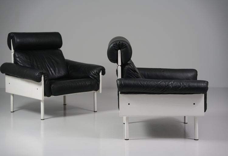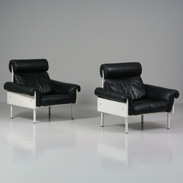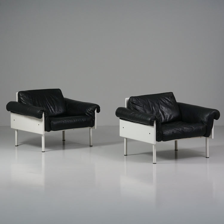 Malli Ateljee nojatuolipari, design Yrjö Kukkapuro, valmistanut Haimi Oy, 60-luku. Leimattu. Valkoiseksi maalattu puurunko, musta nahkaistuin. Hyvä kunto, ajan patinaa. Nojatuolit myydään yhdessä. Ilmoitettu hinta on settihinta.