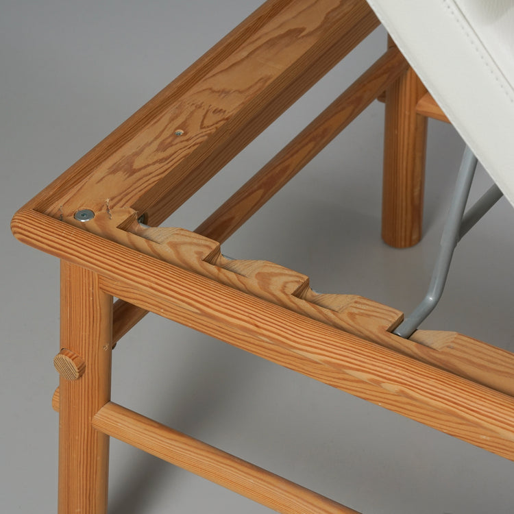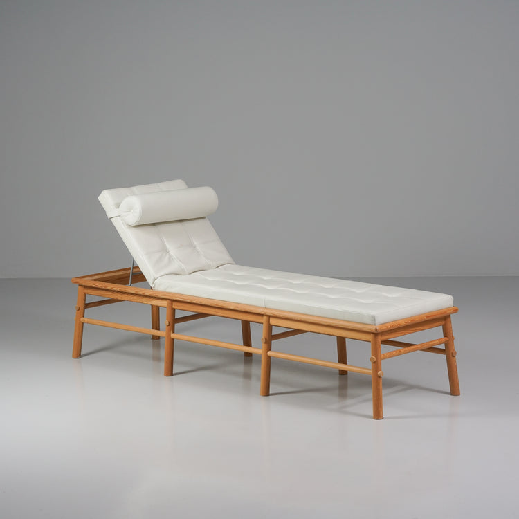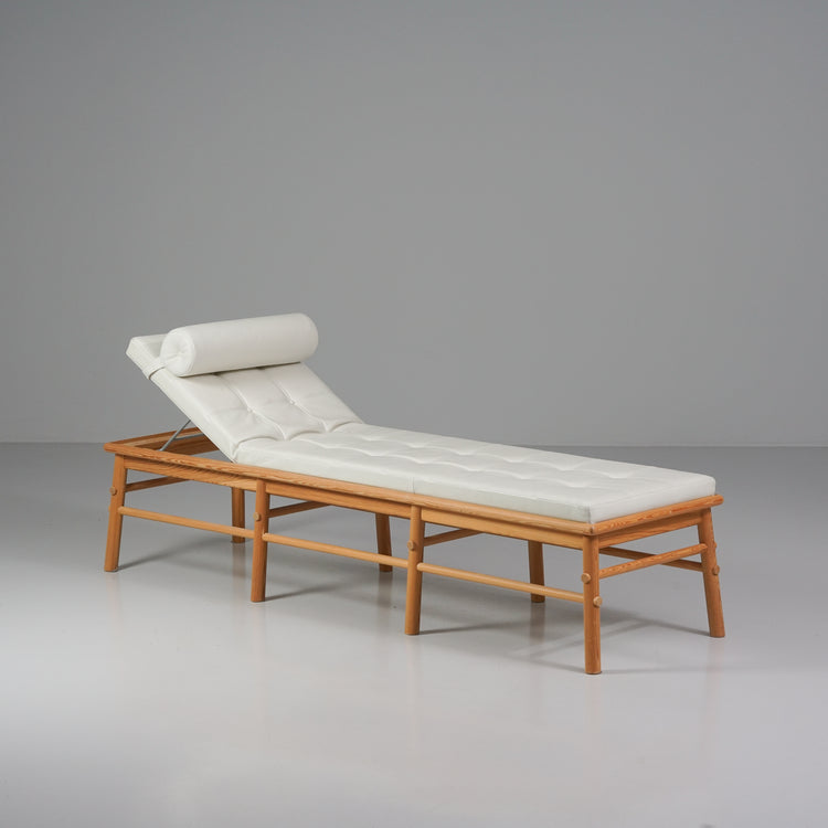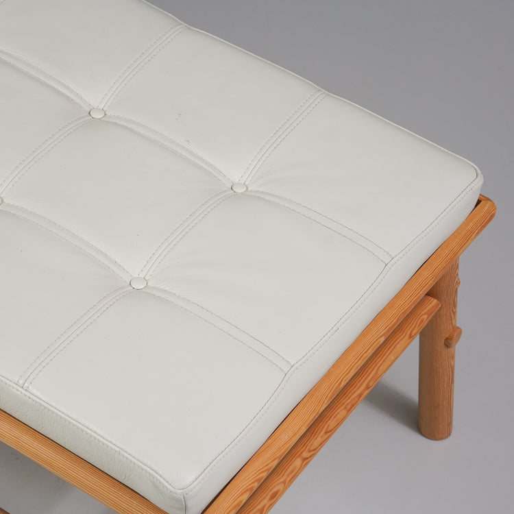Malli "August" daybed, design Nike Karlsson, valmistanut Ikea, 2009. Runko mäntyä, nahka verhoilu. Mahdollista nostaa penkin pääty selkänojaksi. Niskatyyny irrotettava. Hyvä kunto, ajan patinaa ja jälkeä nahassa, ks. kuvat.