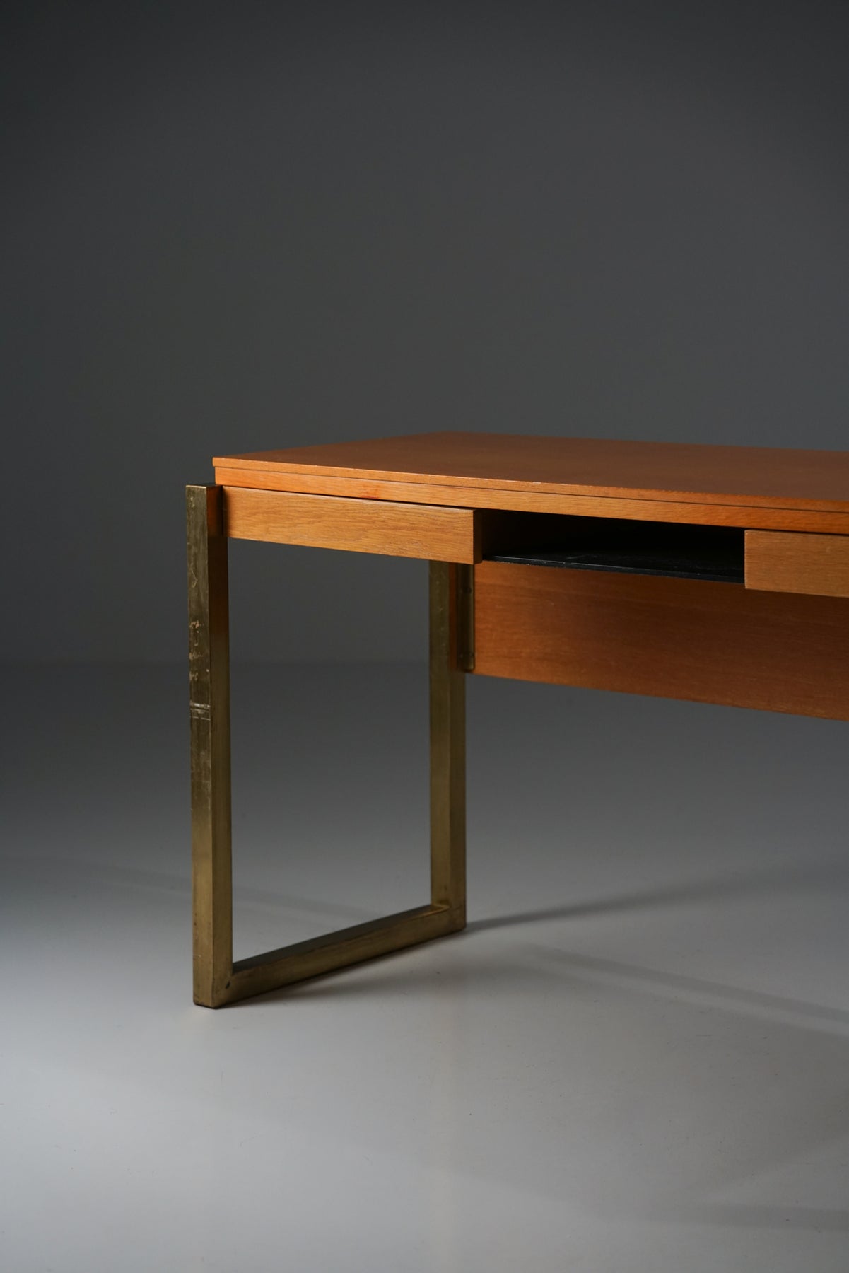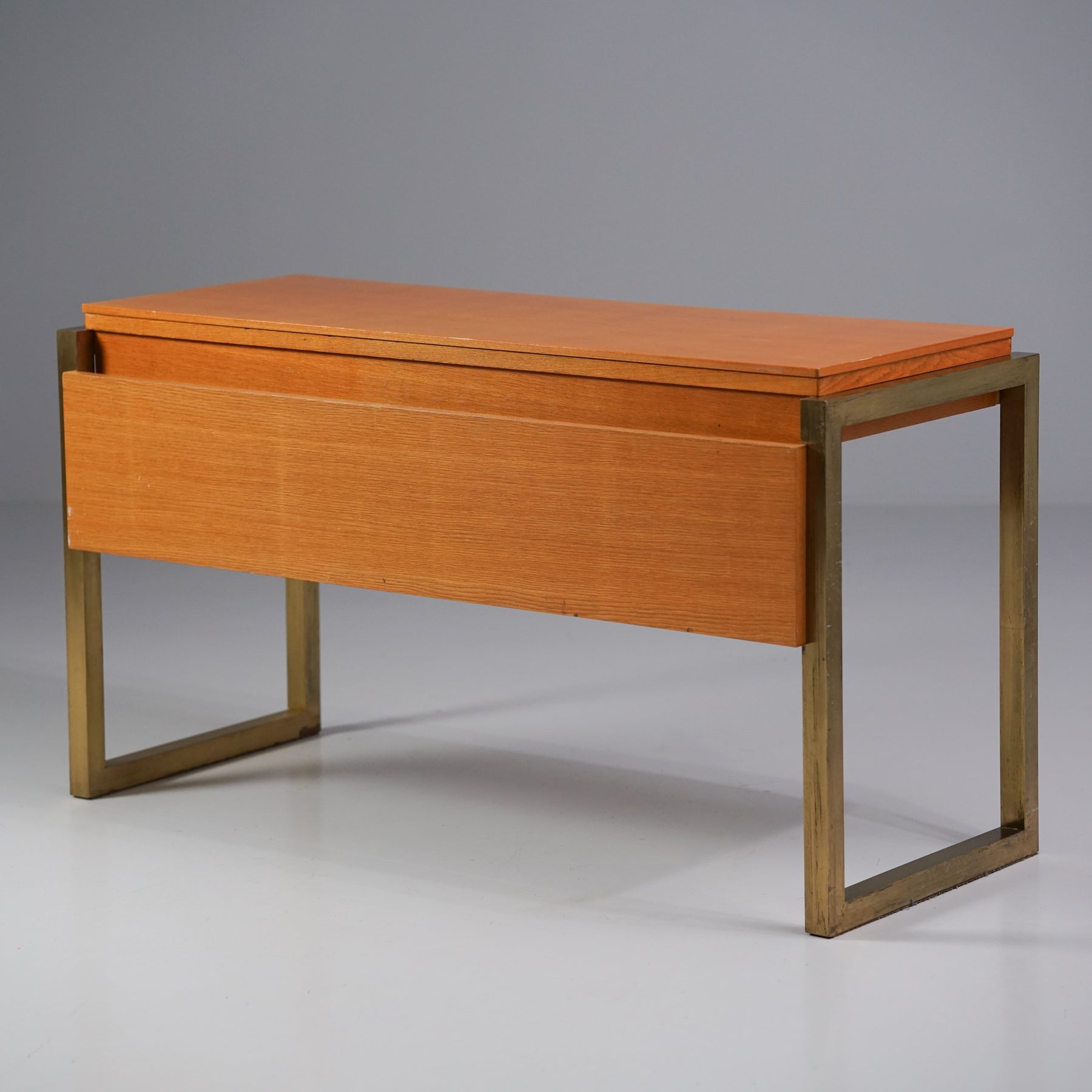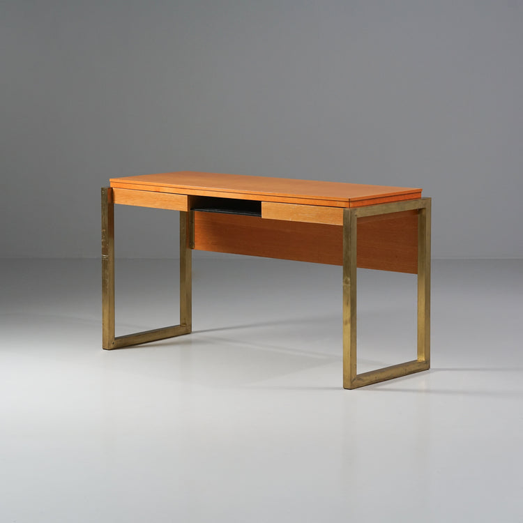 Työpöytä, suunnitellut Arkkitehtitoimisto Veikko Voutilainen tilaustyönä Elimäen kunnantalolle, 1965. Lakattu ja petsattu tammi, jalat messinkiä. Molemmilla sivuilla laatikot. Takapaneeli mahdollista irrottaa. Hyvä kunto, ajan patinaa ja pientä jälkeä.