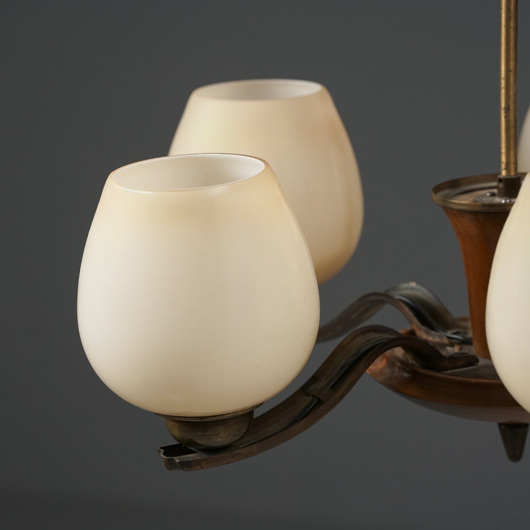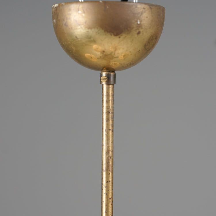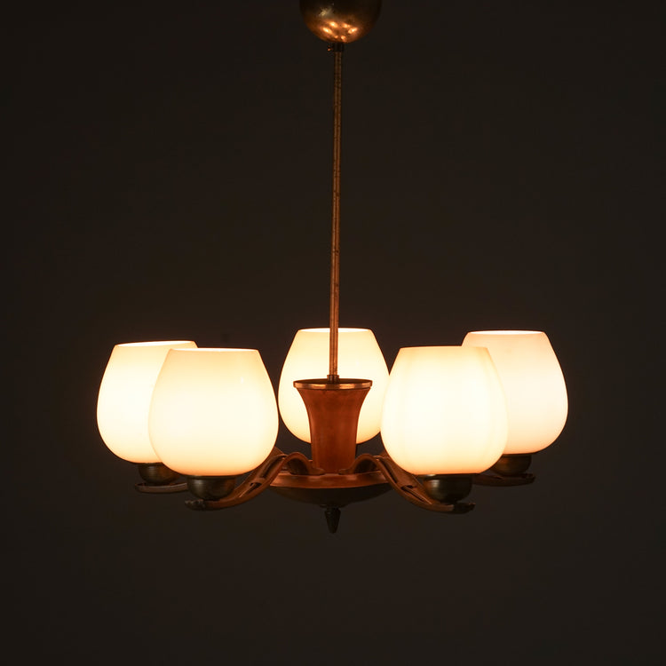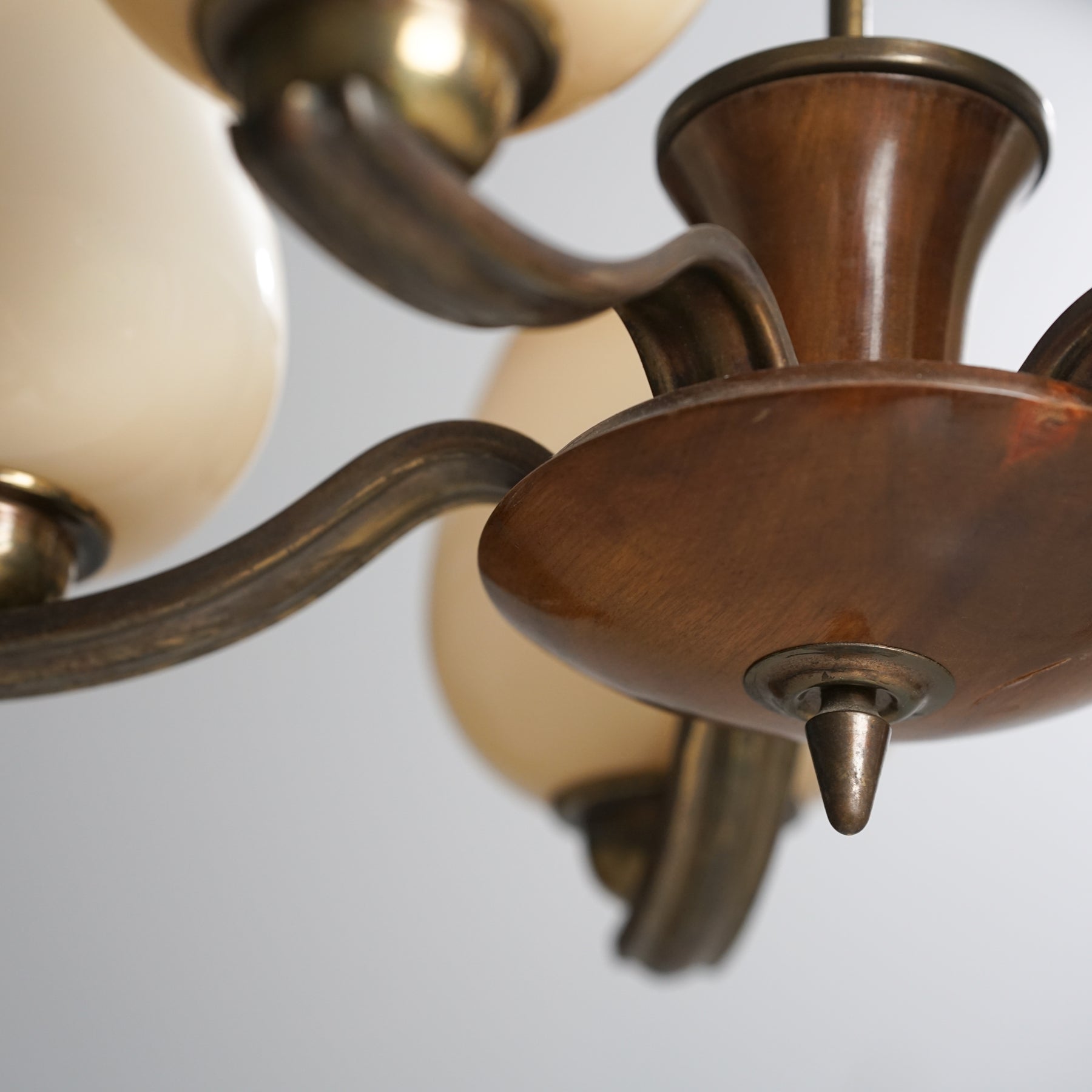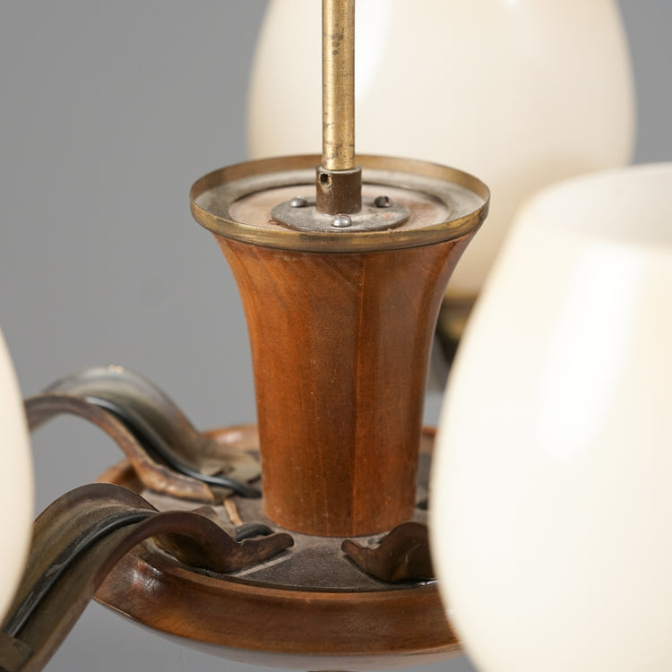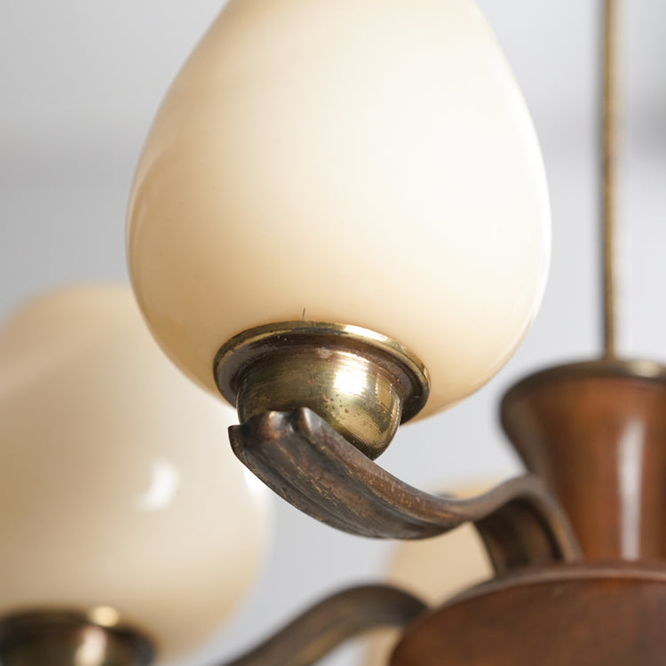Kattovalaisin malli 1256/3, design Paavo Tynell, valmistanut Taito Oy, 30/40-luku. Runko messinkiä ja koivua. Opaali lasikuvut. Hyvä kunto, ajan patinaa.