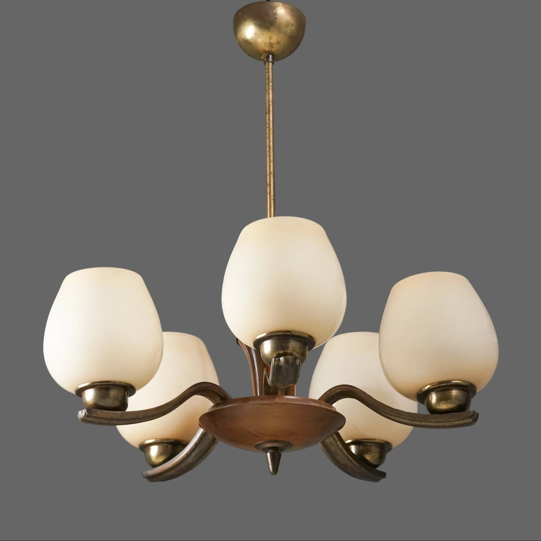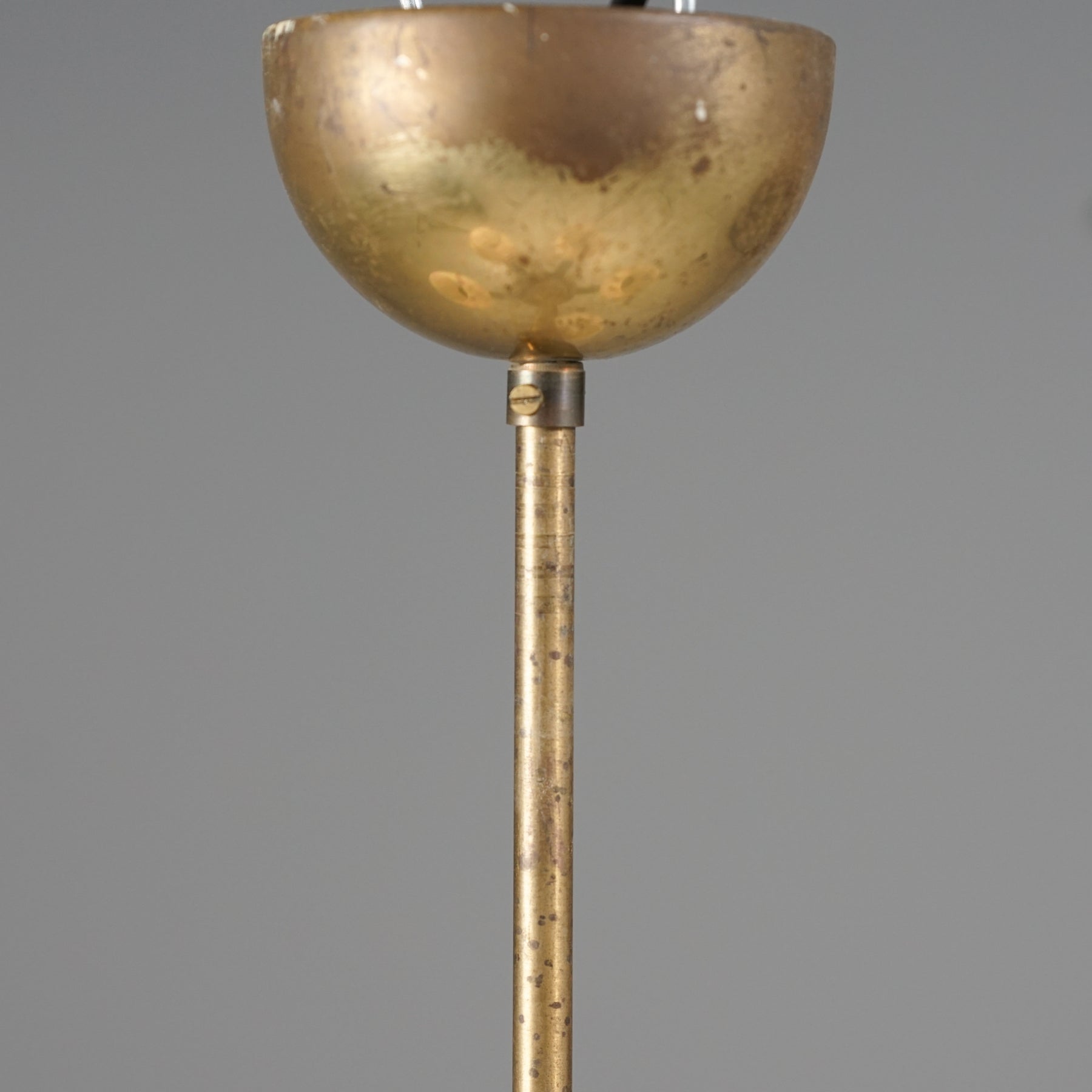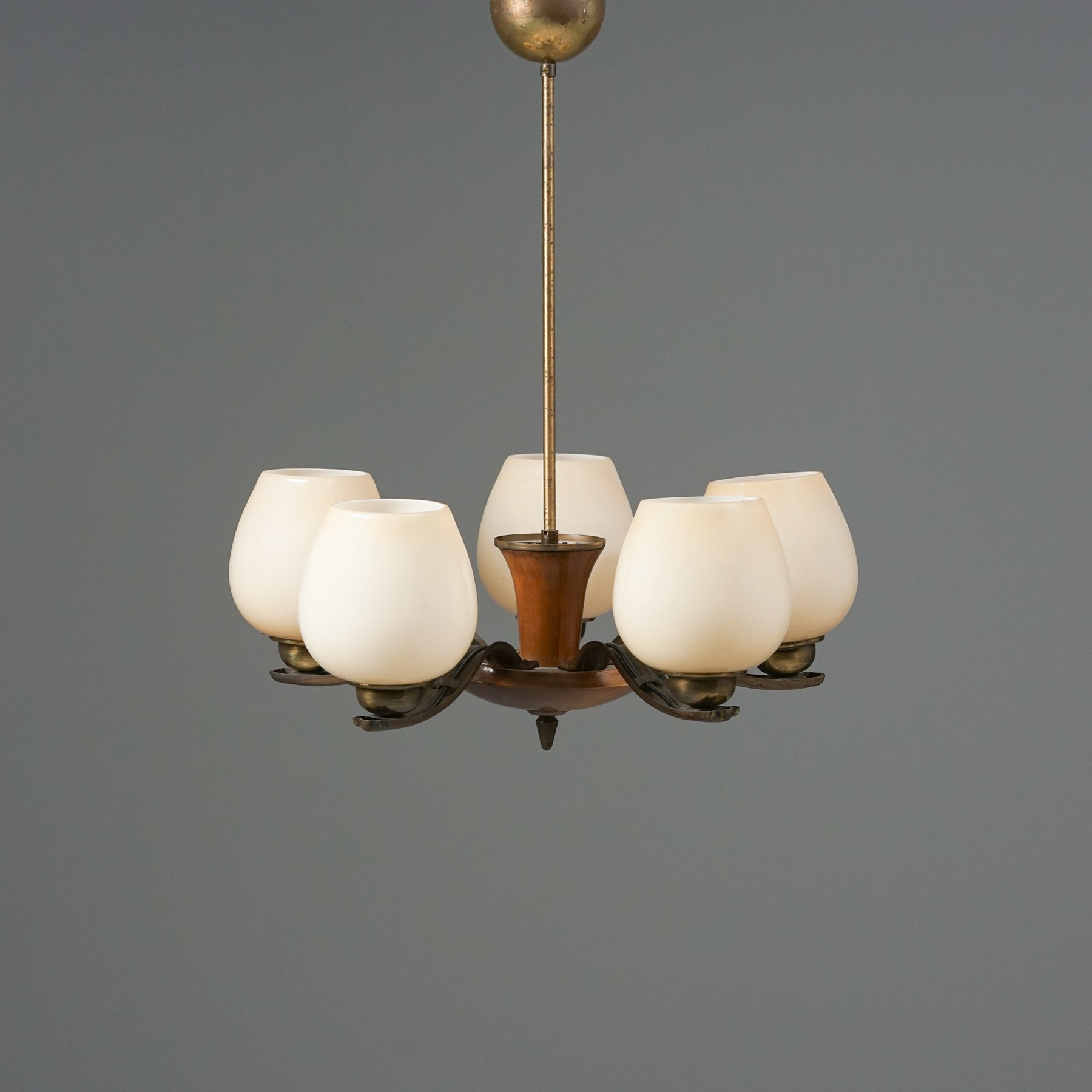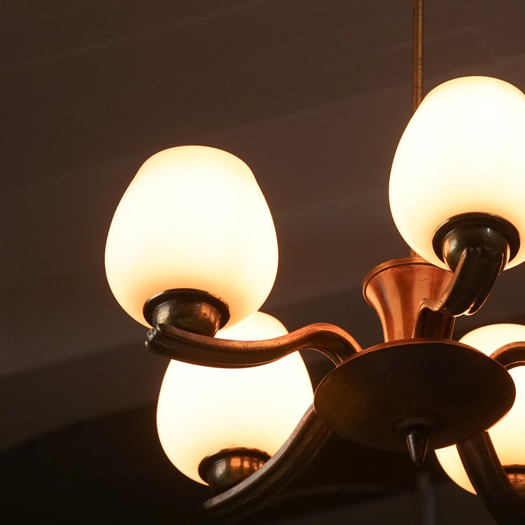 Kattovalaisin malli 1256/3, design Paavo Tynell, valmistanut Taito Oy, 30/40-luku. Runko messinkiä ja koivua. Opaali lasikuvut. Hyvä kunto, ajan patinaa.