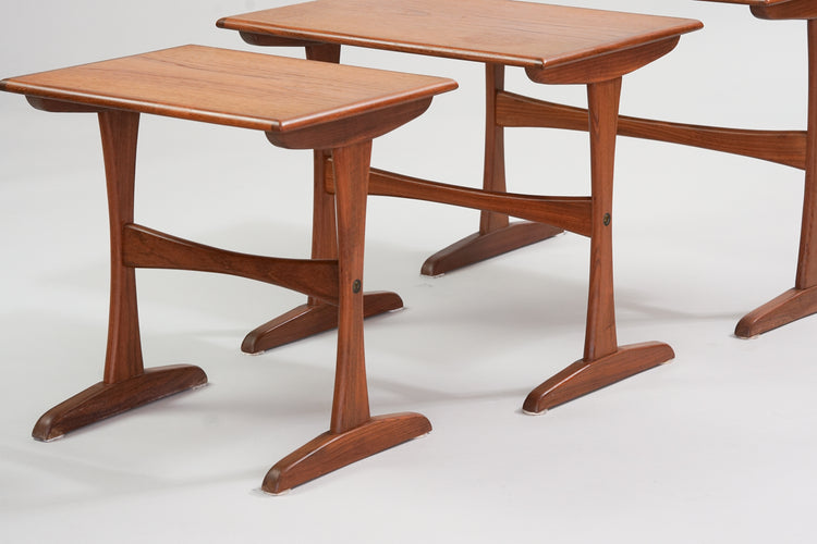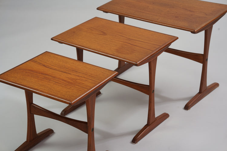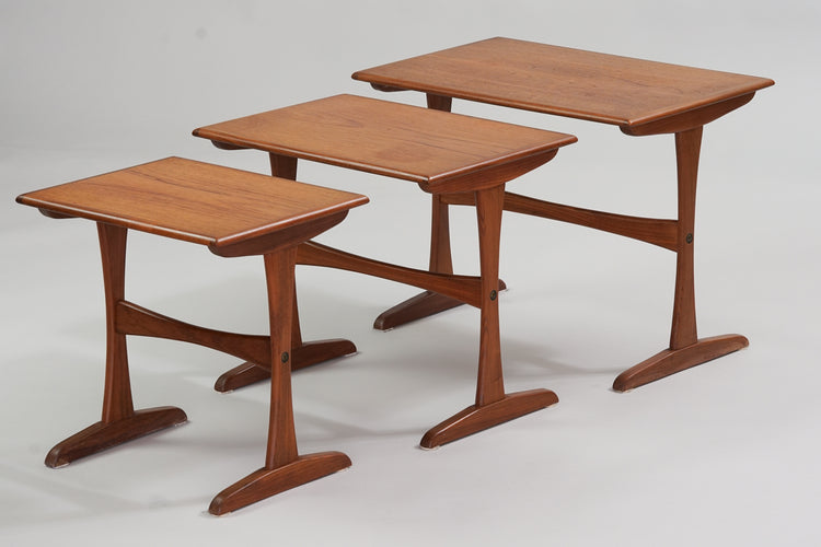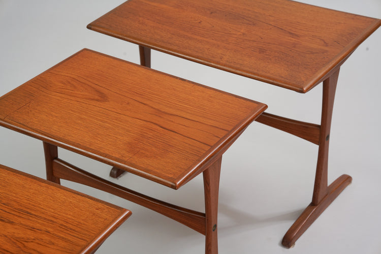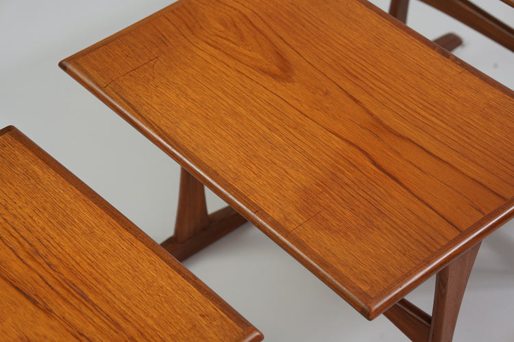 Sarjapöytä (2kpl erikseen myytävänä), design Kai Kristiansen, valmistettu Tanskassa, 60-luku, tiikkiä. Hyvä kunto, ajan patinaa ja pientä jälkeä eritoten keskimmäisessä pöydässä (ks. Kuvat)