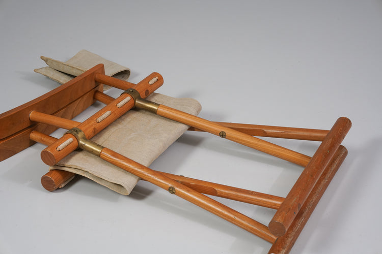 Malli "Sune" taitettava tuoli (3 kpl myydään erikseen), design Sune Lindström, valmistanut Nordiska Kompaniet, 60-luku. Runko jalavaa, pellava istuimet, messinki yksityiskohdat. Hyvä kunto, ajan patinaa. Tuolit myydään erikseen. Ilmoitettu hinta on kappalehinta.
