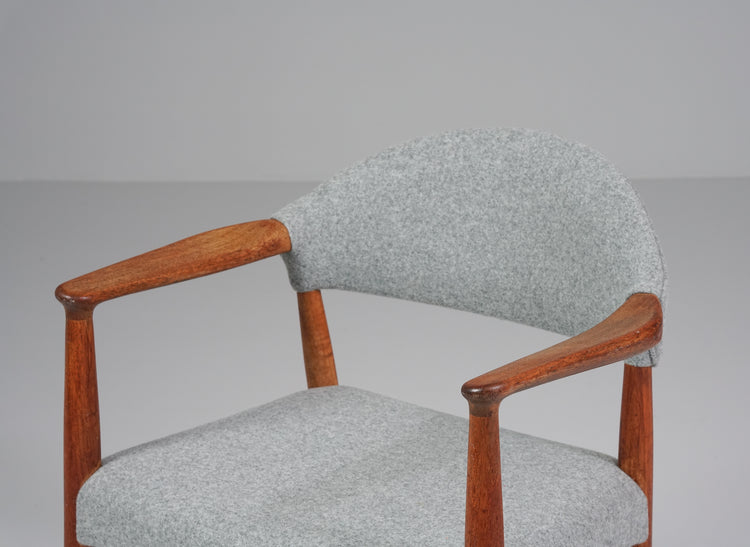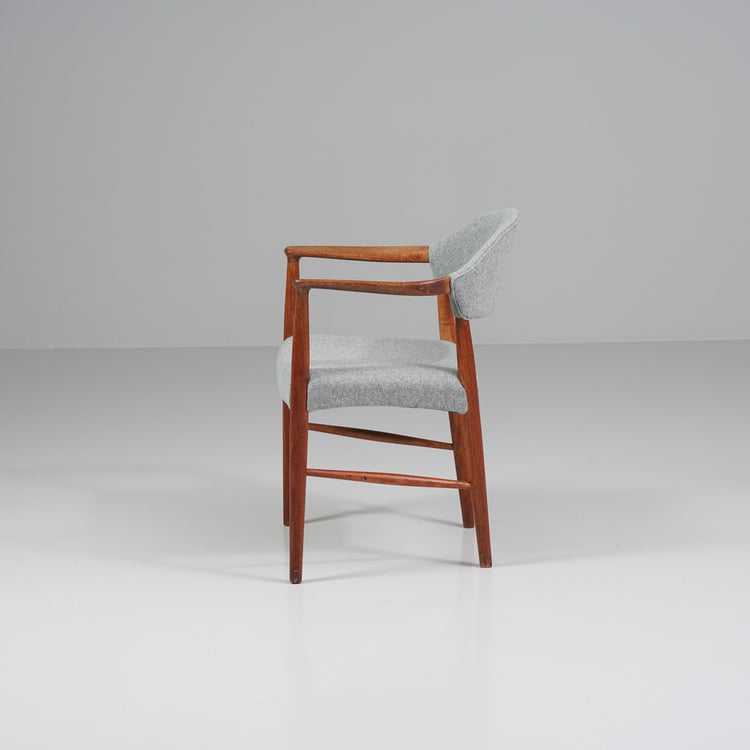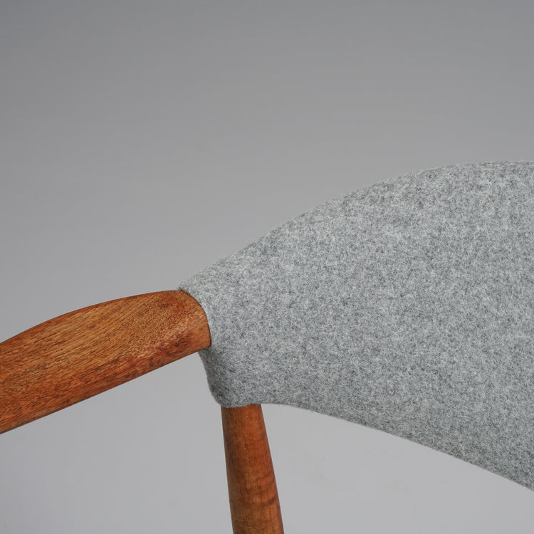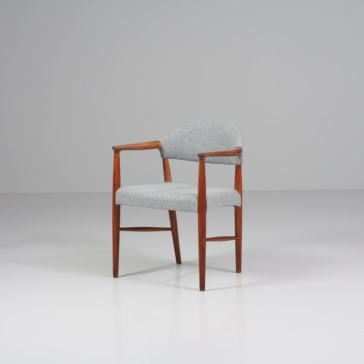 Tuoli, design Kurt Olsen, valmistanut Slagelse Møbelfabrik, Tanska, 60-luku. Runko tiikkiä, myöhemmin uudelleen verhoiltu villasekoite kankaalla. Hyvä kunto, pientä ajan patinaa.