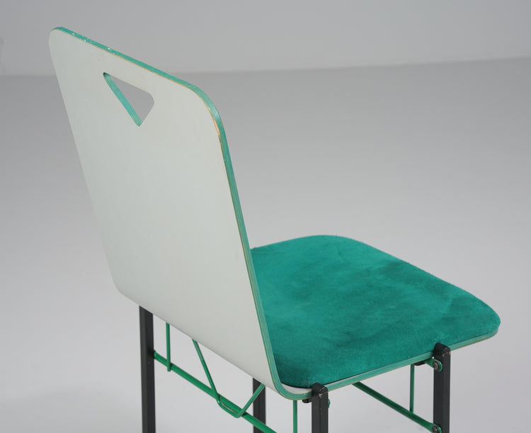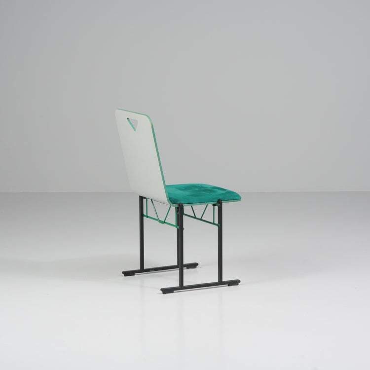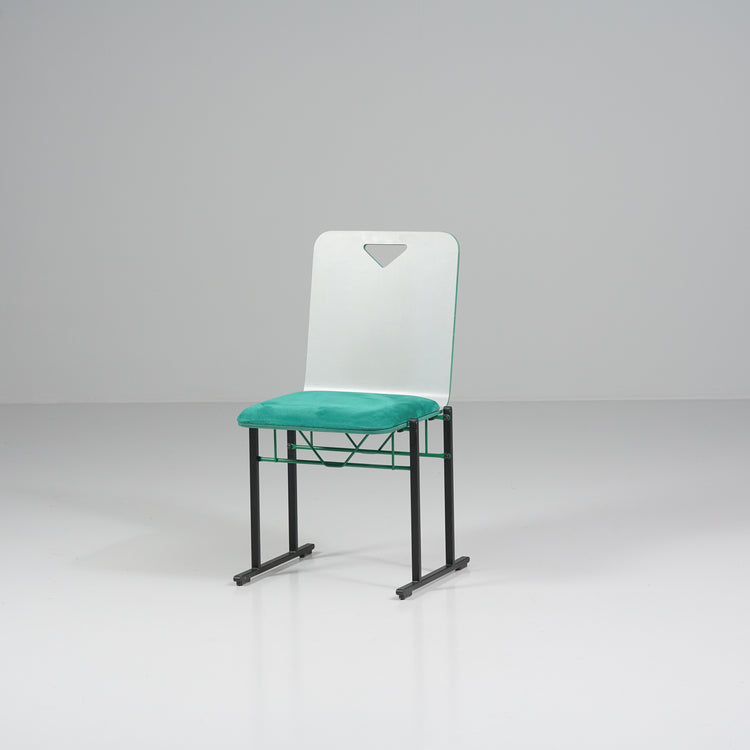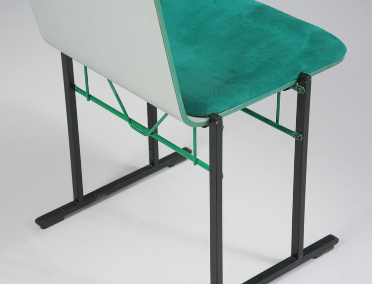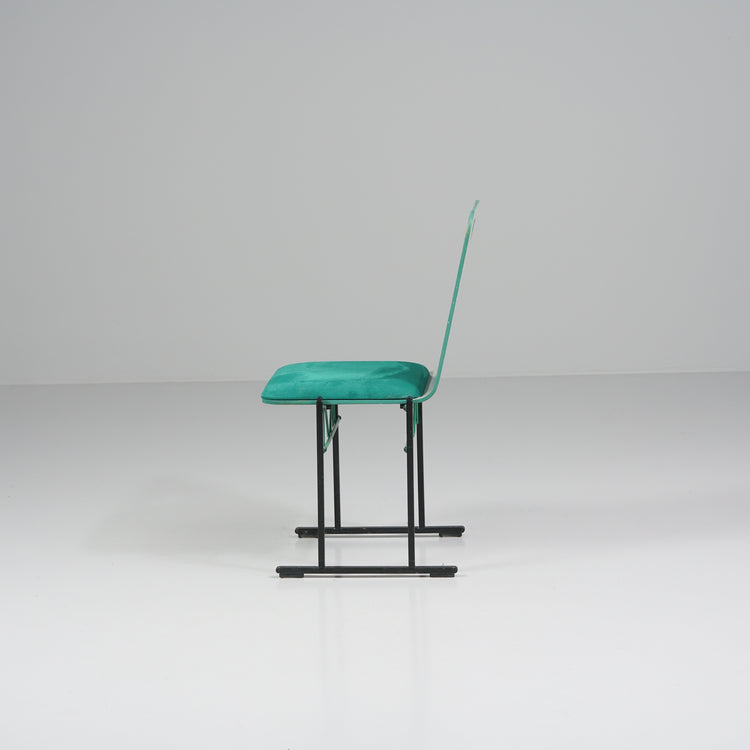 Tuoli malli A500, design Yrjö Kukkapuro, valmistanut Avarte, 80-luku. Runko metallia ja vaneria. Vihreä alcantara verhoilu. Hyvä kunto, ajan patinaa.