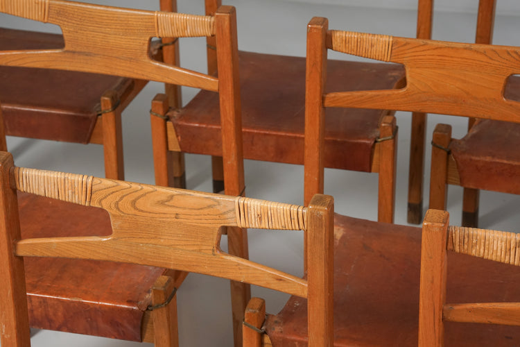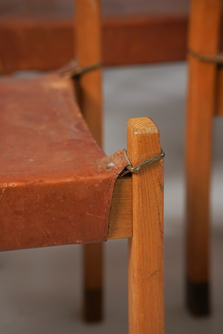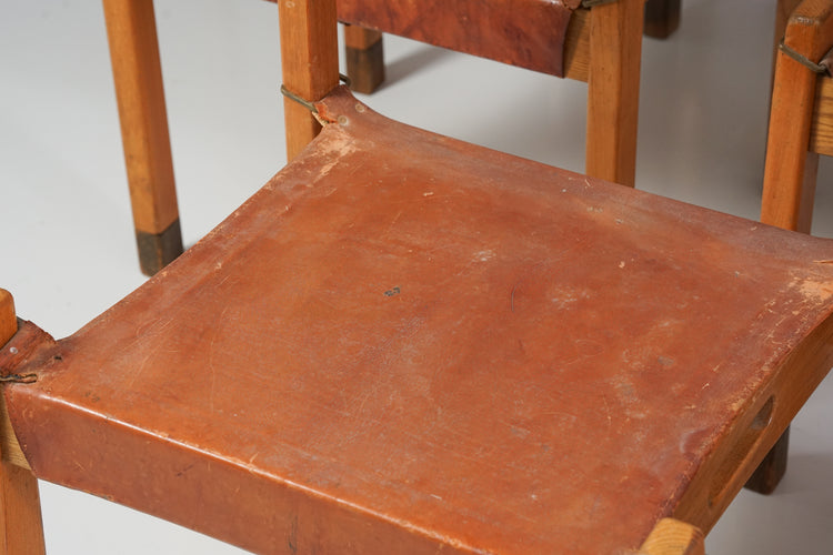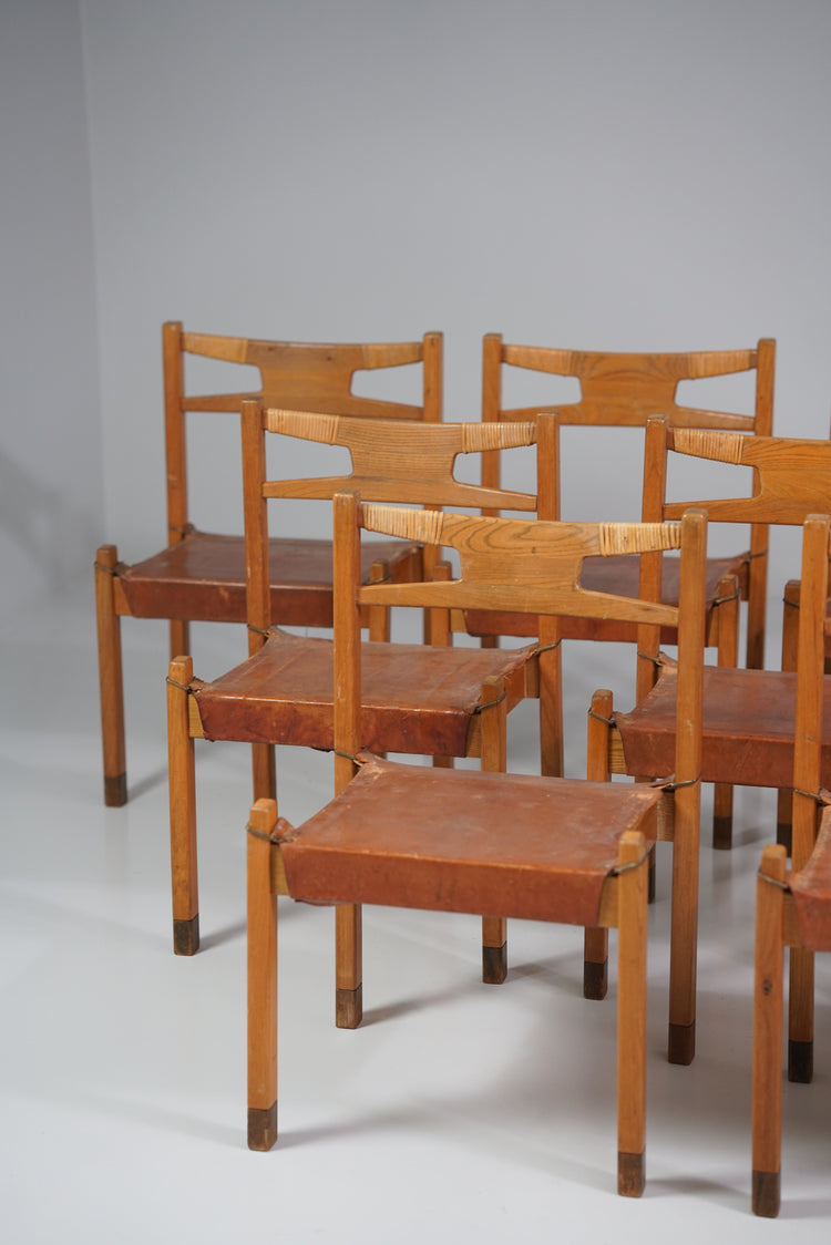 Tuolit (12 kpl myydään settinä), design Aaren Ervi, valmistanut Keravan puusepät, v. 1949. Mänturunko, nahkaistuin, rottinki punos selkänojassa, messinki yksityiskohdat. Hyvä kunto, runsasta ajan patinaa ja jälkeä. Tuolit myydään yhdessä settinä.
