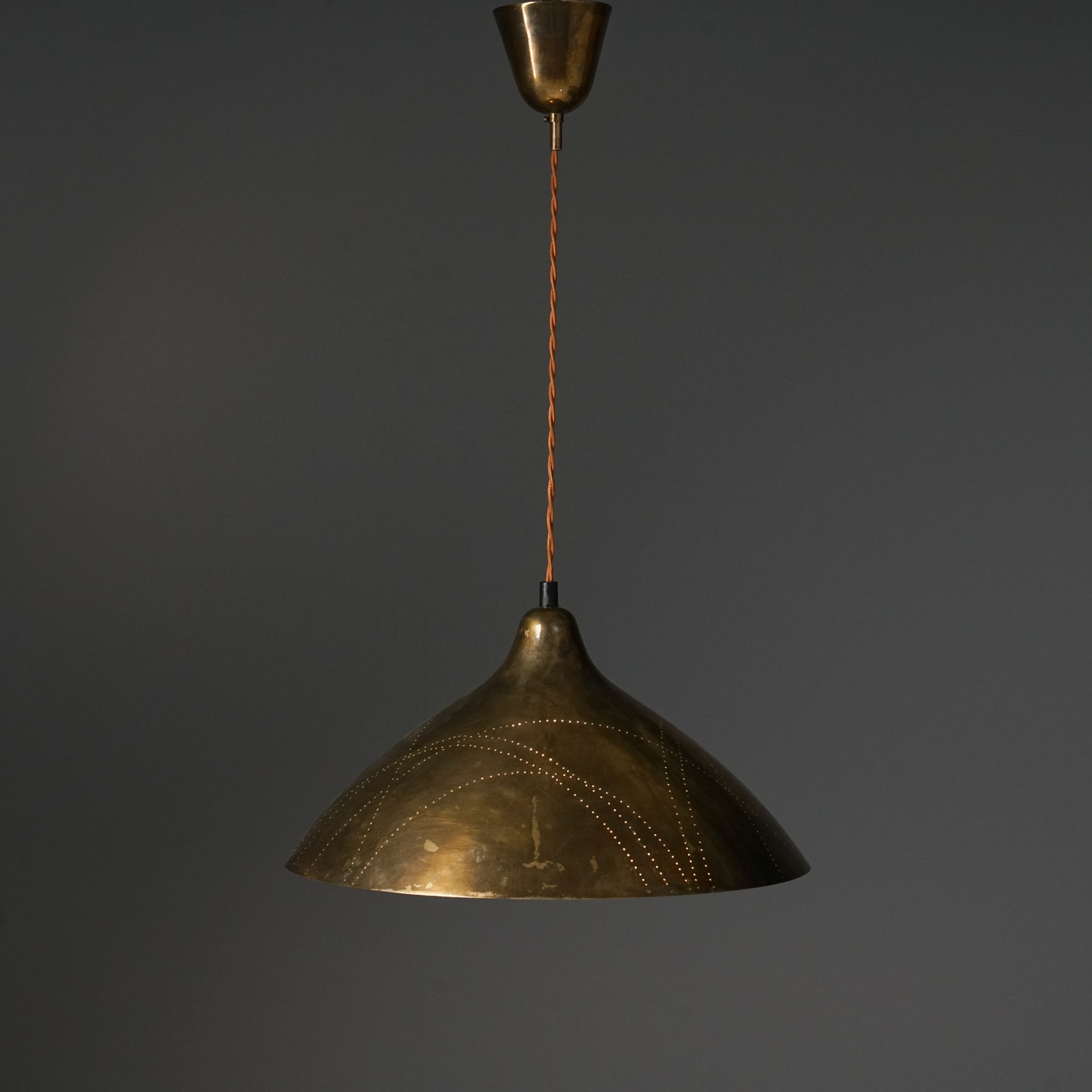 Pendant, design Lisa Johansson-Pape, manufactured by Orno, 1940/1950s. Brass. Fabric glare protection. String cord. Adjustable shade. Good vintage condition, minor patina consistent with age and use.