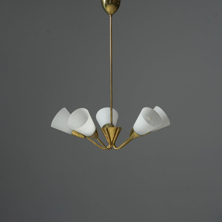 Pendant, manufactured by Itsu, 1950s. Brass frame, opaline glass shades. Marked. Good vintage condition, minor patina consistent with age and use.