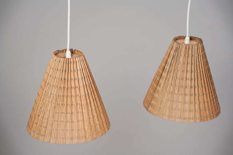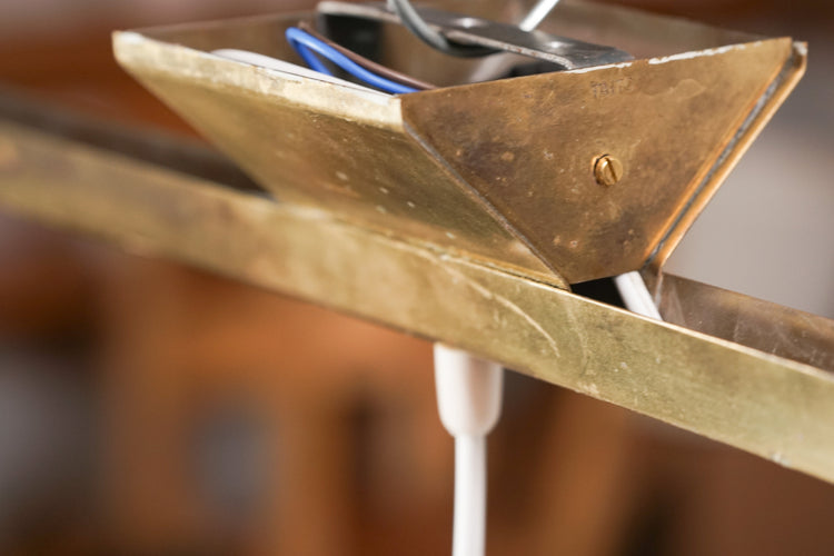 Pendant, designed by Paavo Tynell, manufactured by Taito Oy, 1940s, newly handmade wooden shades. Brass frame. Good vintage condition, minor patina consistent with age and use.