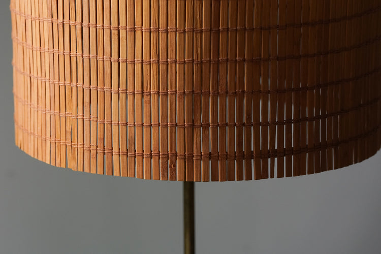 Floor light model 9633, designed by Paavo Tynell, manufactured by Taito Oy, 1940/1950s. Brass frame, handmade wood slat shade. Marked. Good vintage condition, patina consistent with age and use.