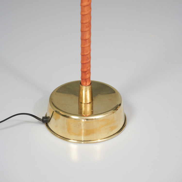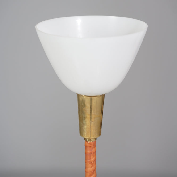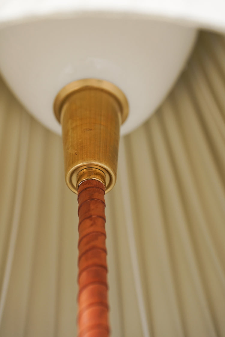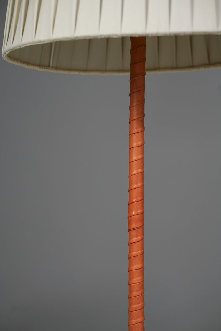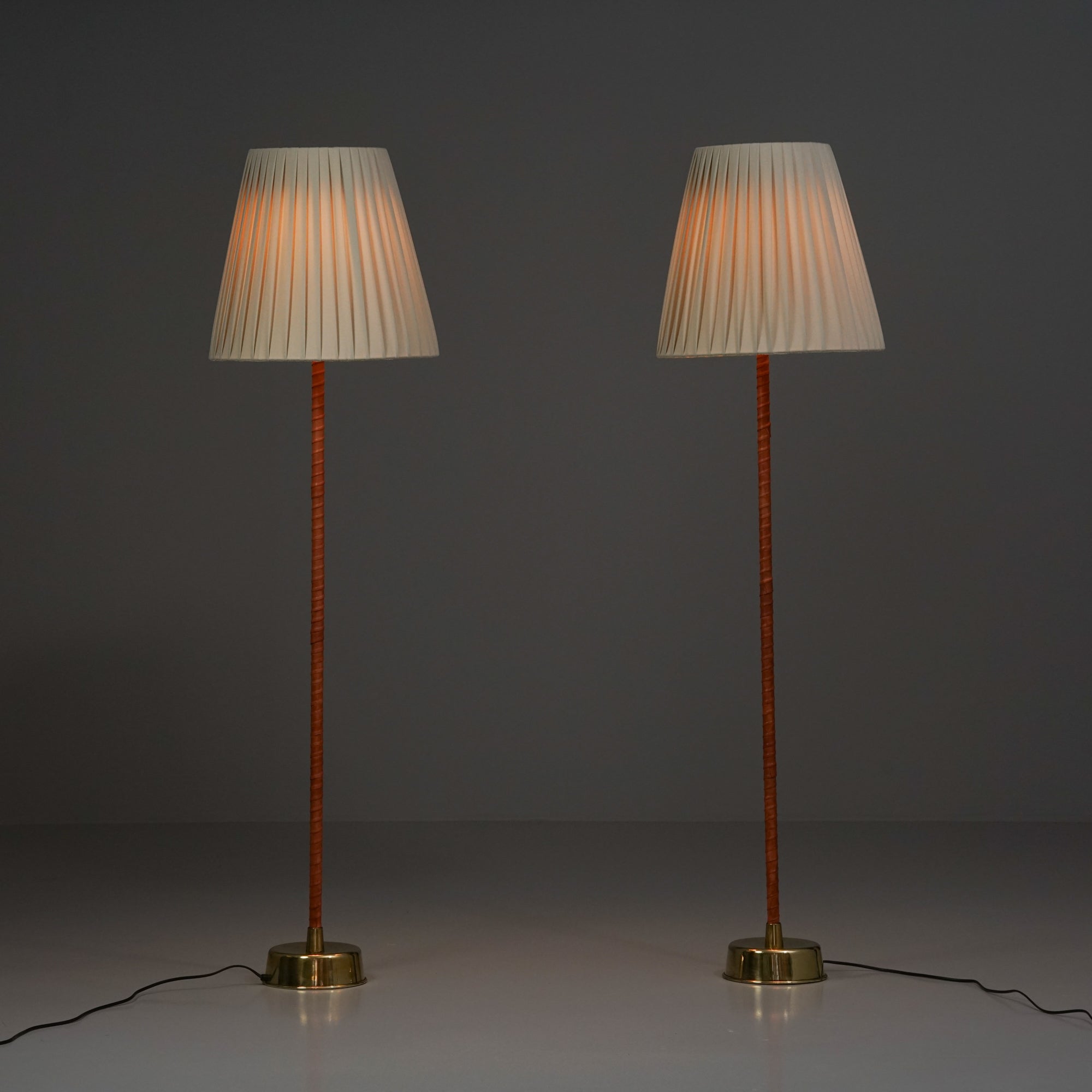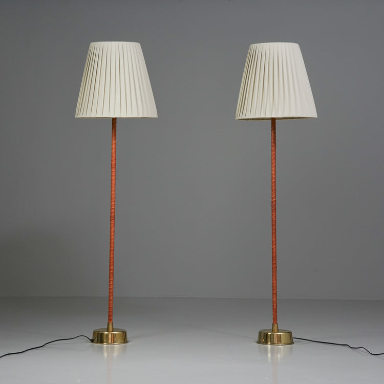 Pair of model "Ihanne"/"senator" floor lamps, designed by Lisa Johansson-Pape, manufactured by Orno, 1950s. Leather wrapping on the frame, brass, renewed hand-made fabric shades. Good vintage condition, patina consistent with age and use. The floor lamps are sold as a set. The price indicated is the price for the set.