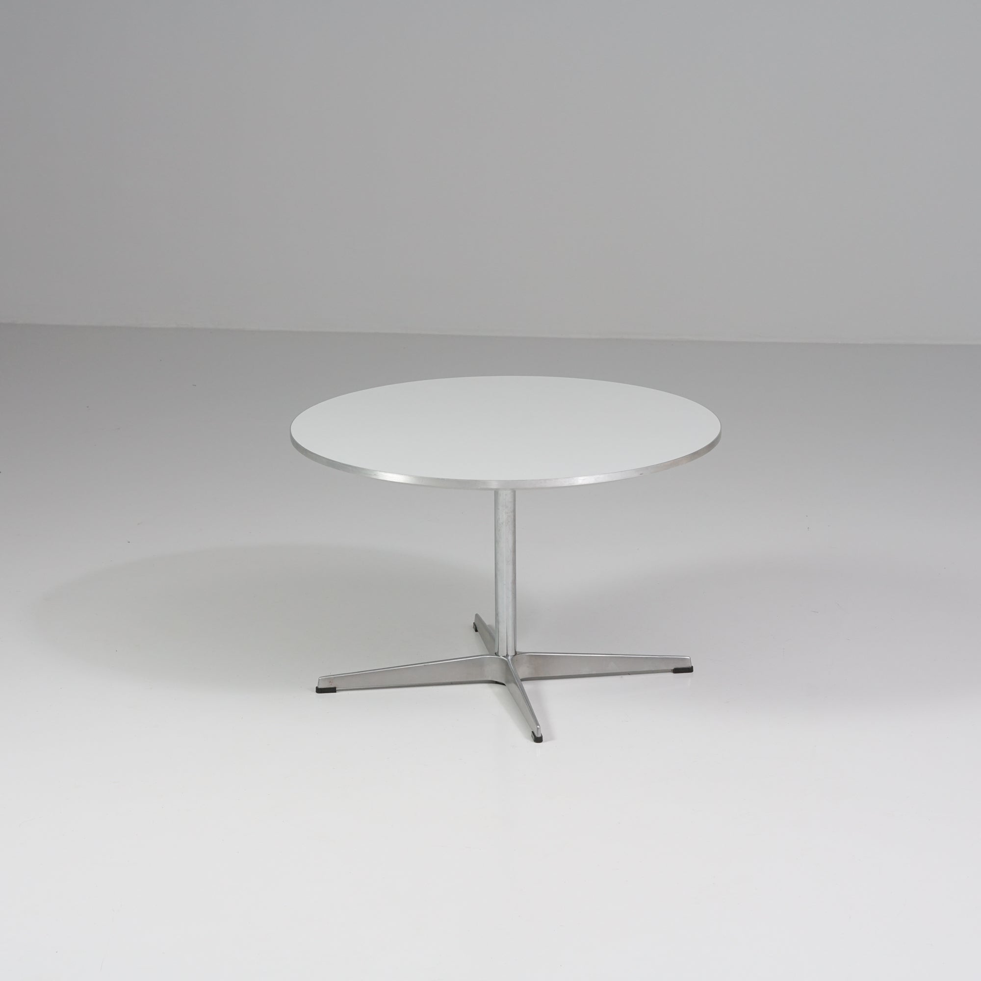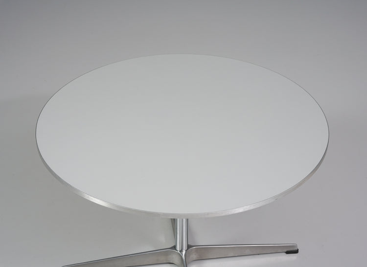 Model A222 coffee table, Arne Jacobsen, Fritz Hansen, Early 2000s. Laminate, aluminum and steel. Marked. Good vintage condition, minor patina consistent with age and use.