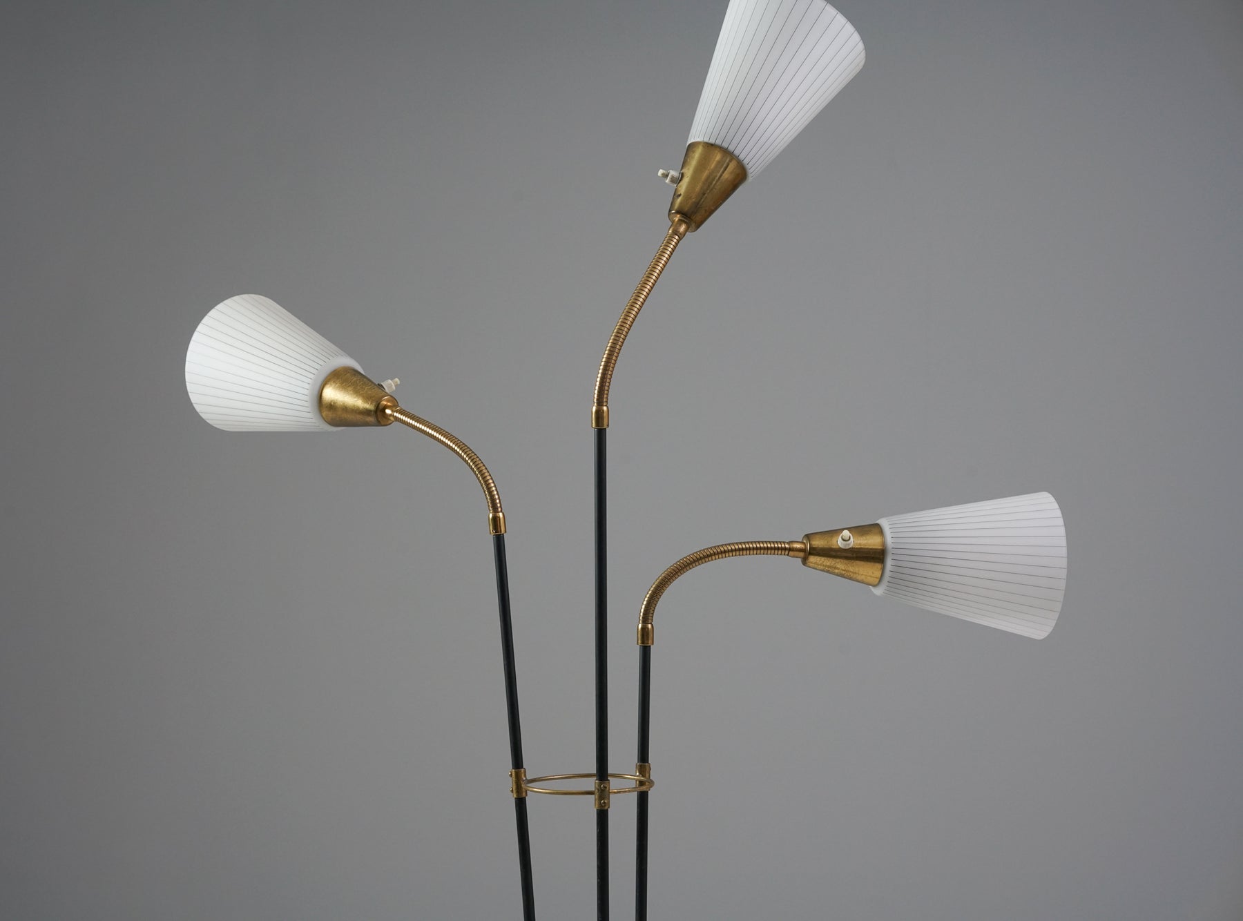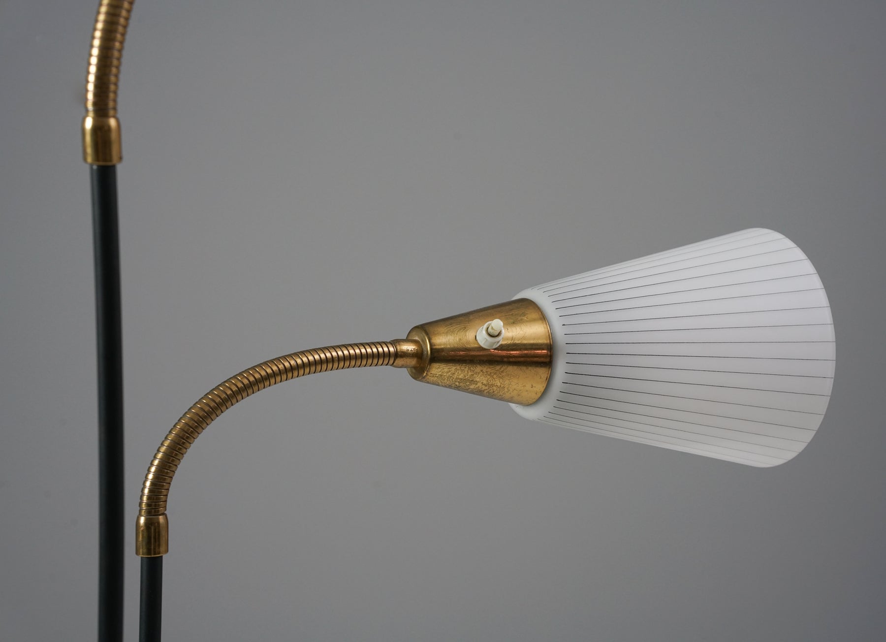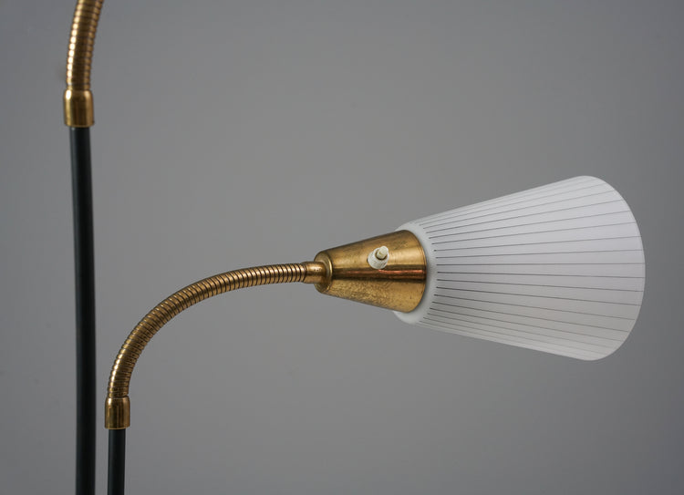Lattiavalaisin, valmistettu Suomessa, 50-luku. Runko messinkiä, maalattu metallirunko, lasikuvut. Kupujen suuntaa mahdollista säädellä. Hyvä kunto, ajan patinaa.