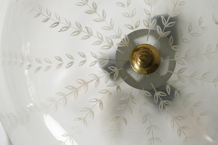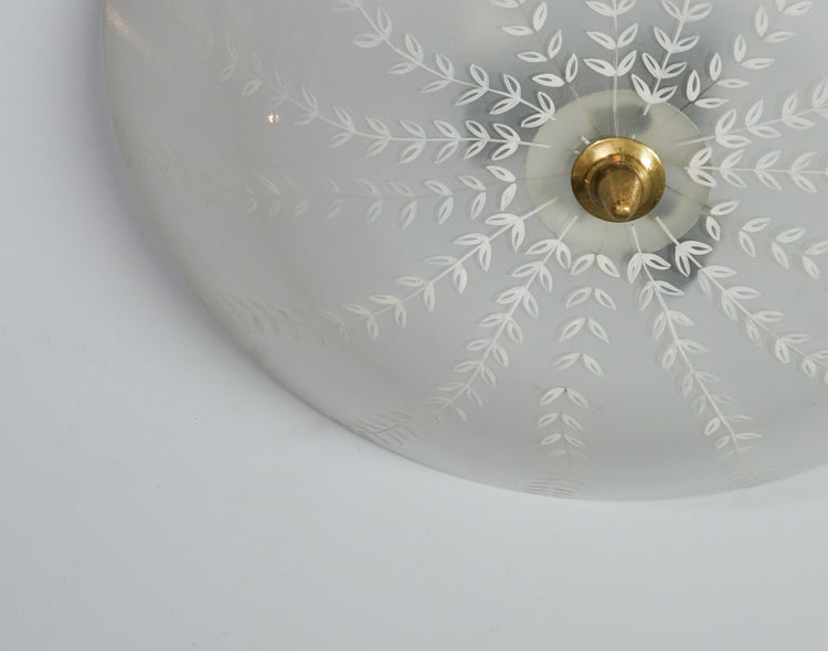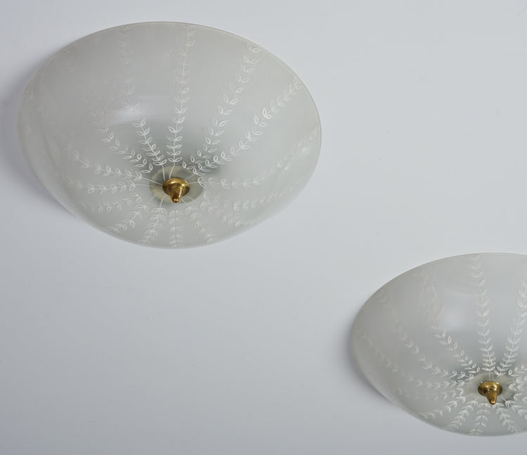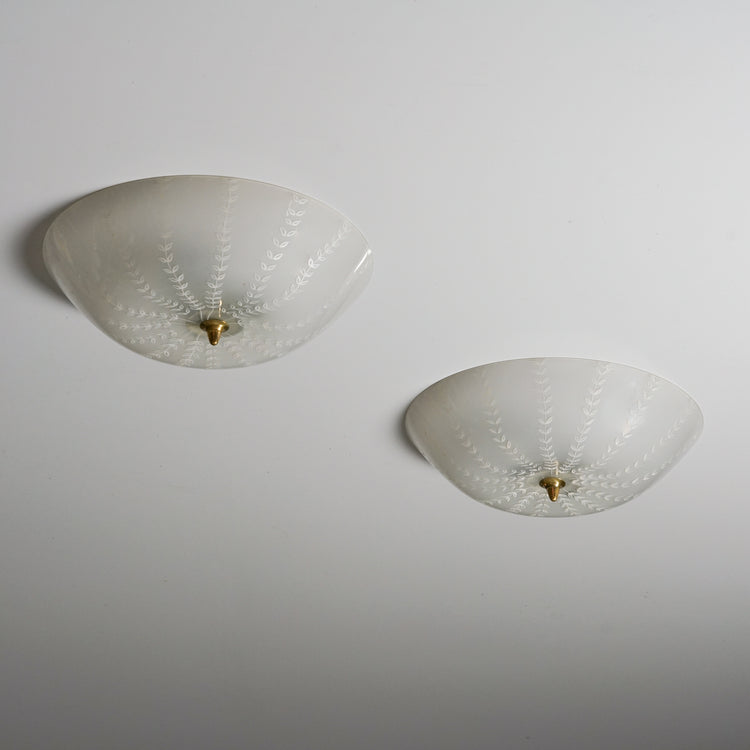 Harvinaisen käsin maalatut plafondit (2 kpl myydään yhdessä) malli 1001, design Lisa Johansson-Pape, valmistanut Orno, leimattu, 50-luku. Huurrettu opaalilasi jossa käsin maalatut lehdet, messinki yksityiskohdat. Hyvä kunto, pientä ajan patinaa. Plafondit myydään yhdessä. Ilmoitettu hinta on setin hinta.