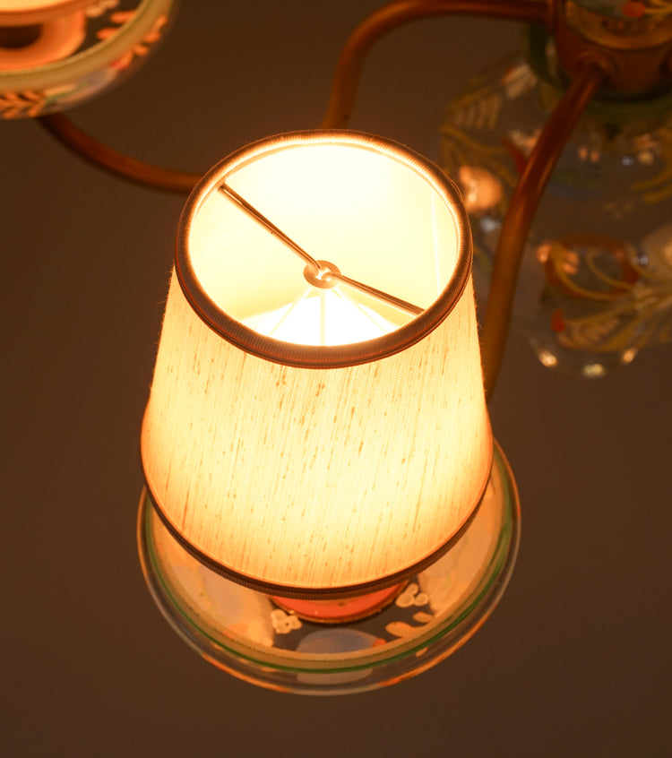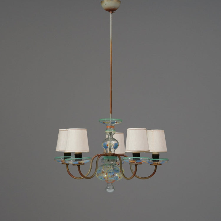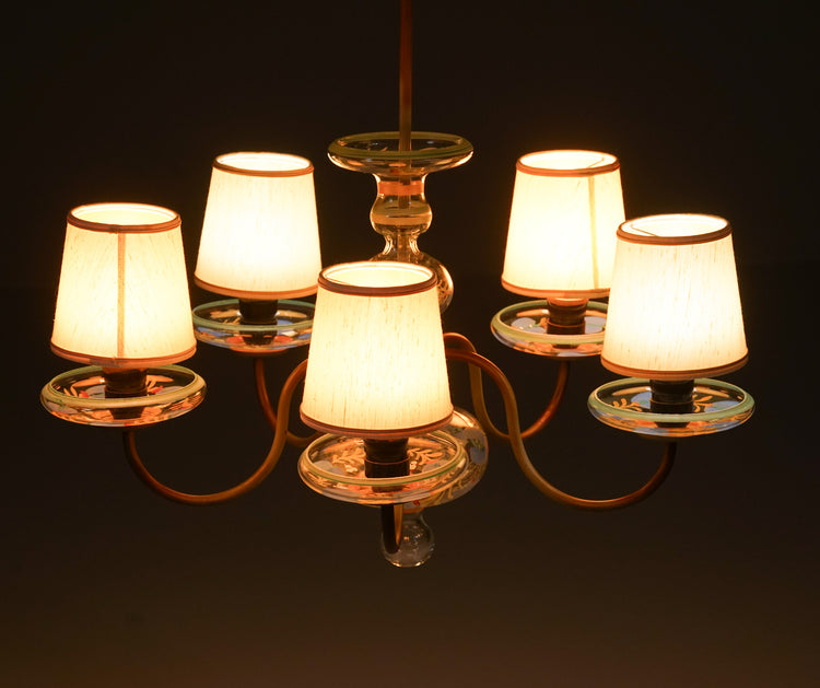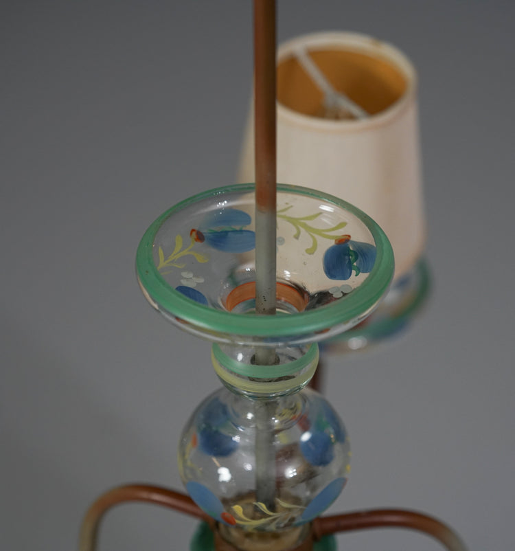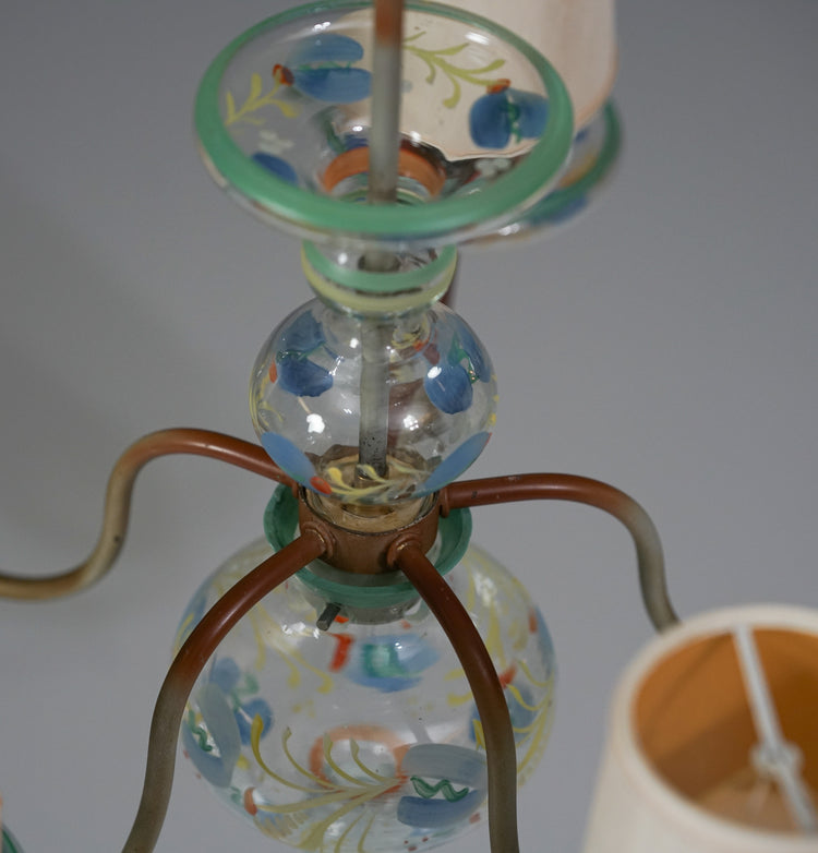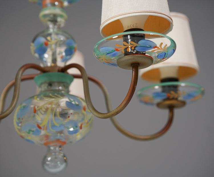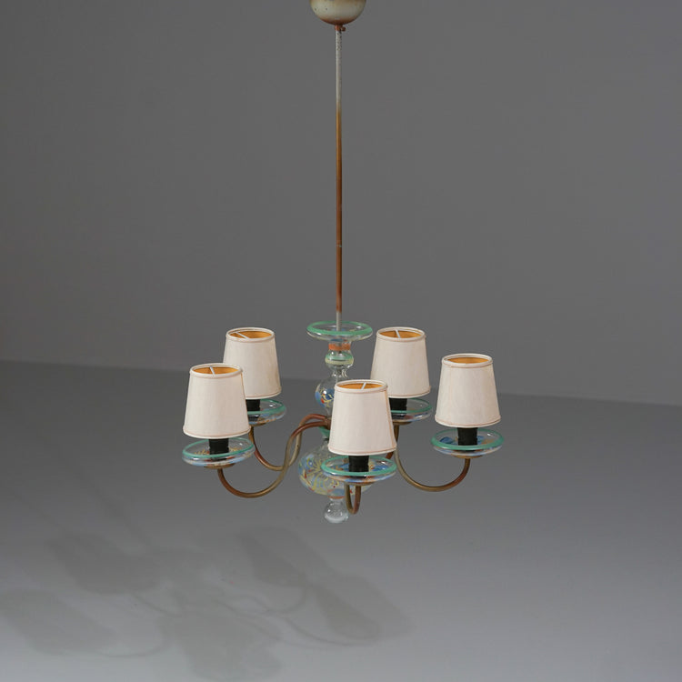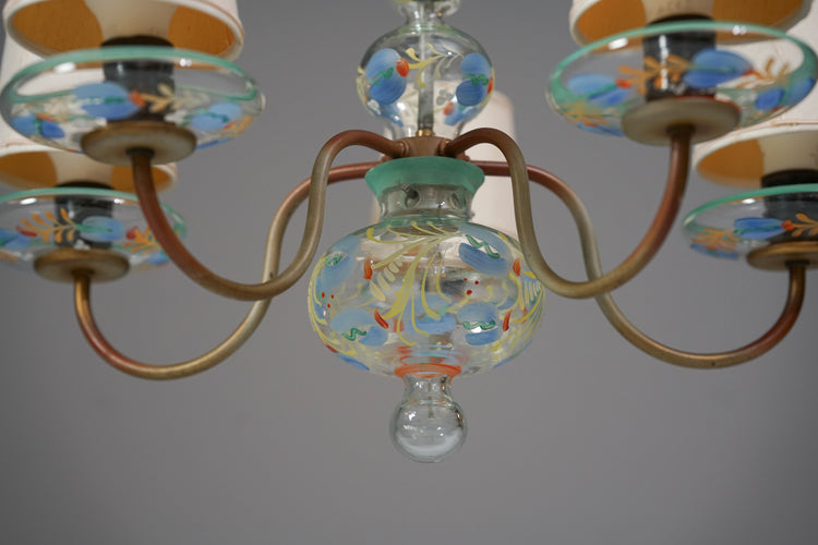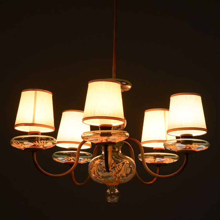 Kattokruunu, design Paavo Tynell, valmistanut Taito Oy, 30/40-luku. Metalli runko, käsin maalatut lasit, kangas varjostimet. Lasit valmistanut Kauklahden lasi. Hyvä kunto, ajan patinaa.