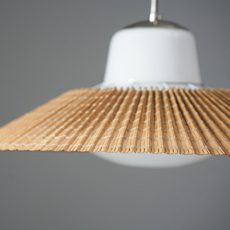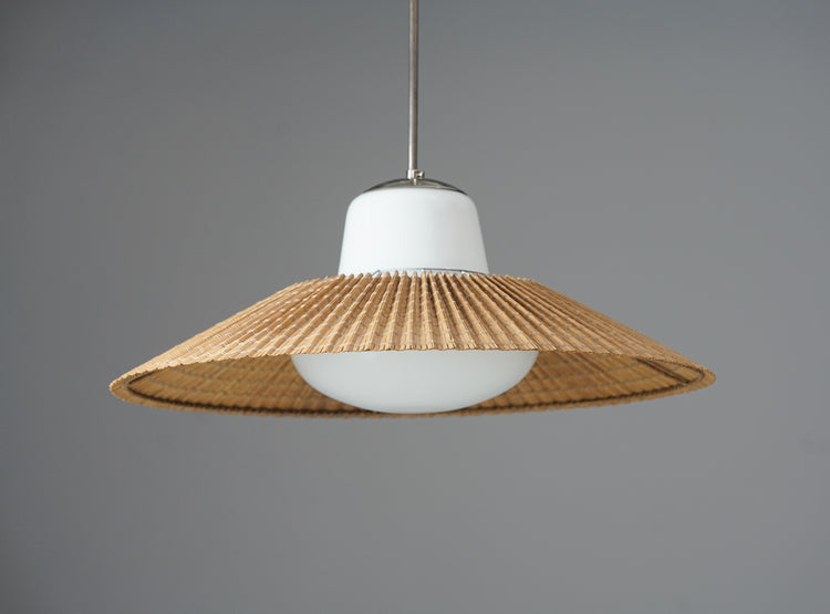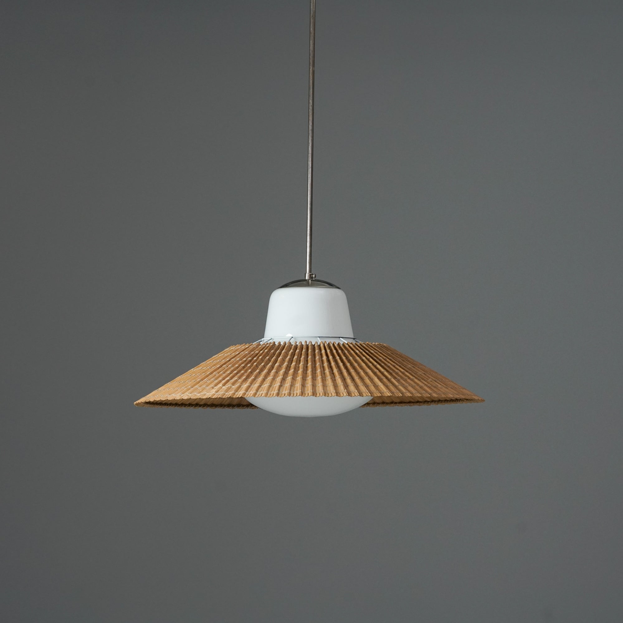 Pendant (3 pieces sold separately), designed by Gunilla Jung & Lisa Johansson-Pape, manufactured by Orno Oy, 1950s. Chromed metal frame, Jung has designed the glass part and Johansson-Pape the wooden slat shade. Marked. Good vintage condition, minor patina and wear consistent with age and use. The pendants are sold pendants. The price indicated is the price for one pendant.
