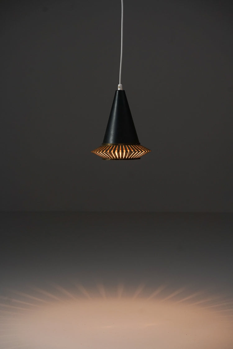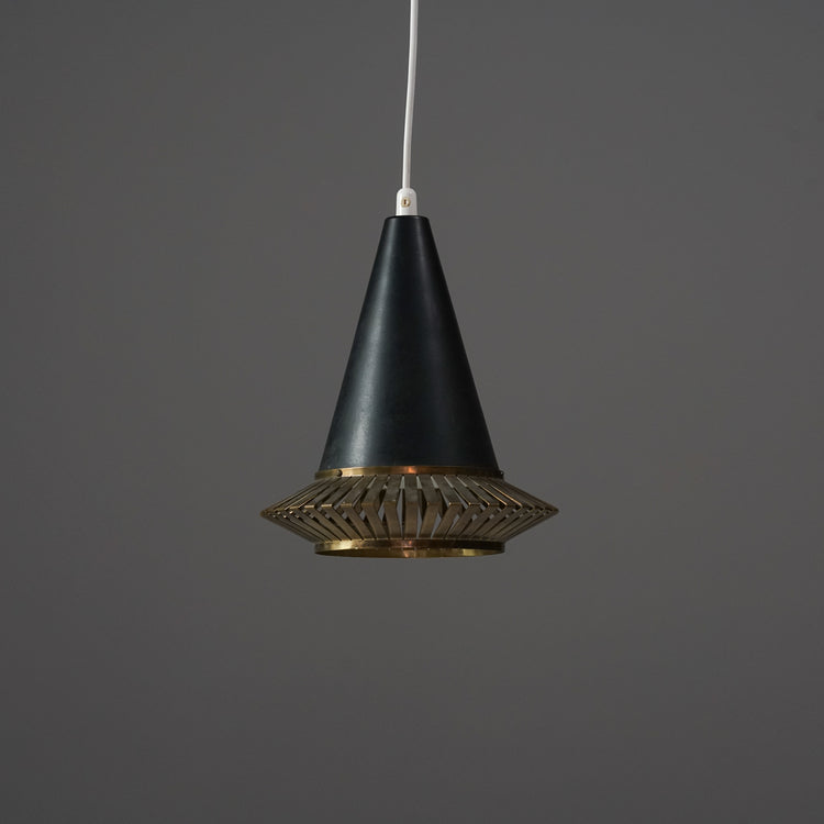 Pendant model K2-1, designed by Maria Lindeman, manufactured by Idman, 1950s. Painted metal and brass. Good vintage condition, patina consistent with age and use.