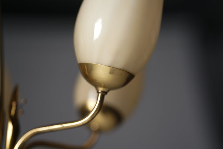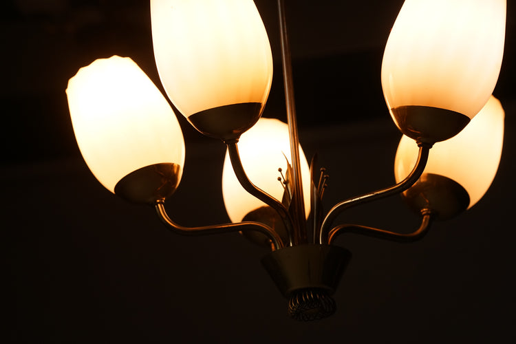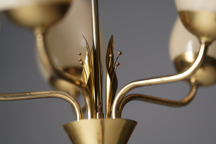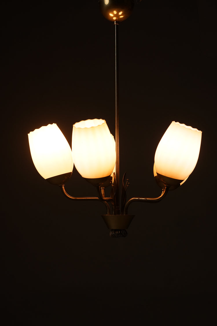 Gorgeous pendant, designed by Mauri Almari, manufactured by Idman, 1950s. Brass frame, glass shades. Good vintage condition, minor patina consistent with age and use.