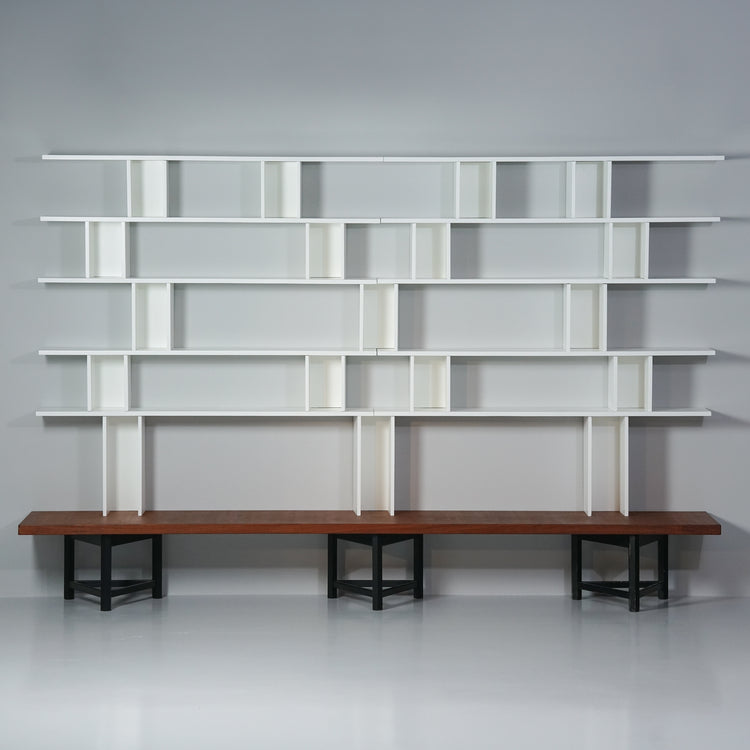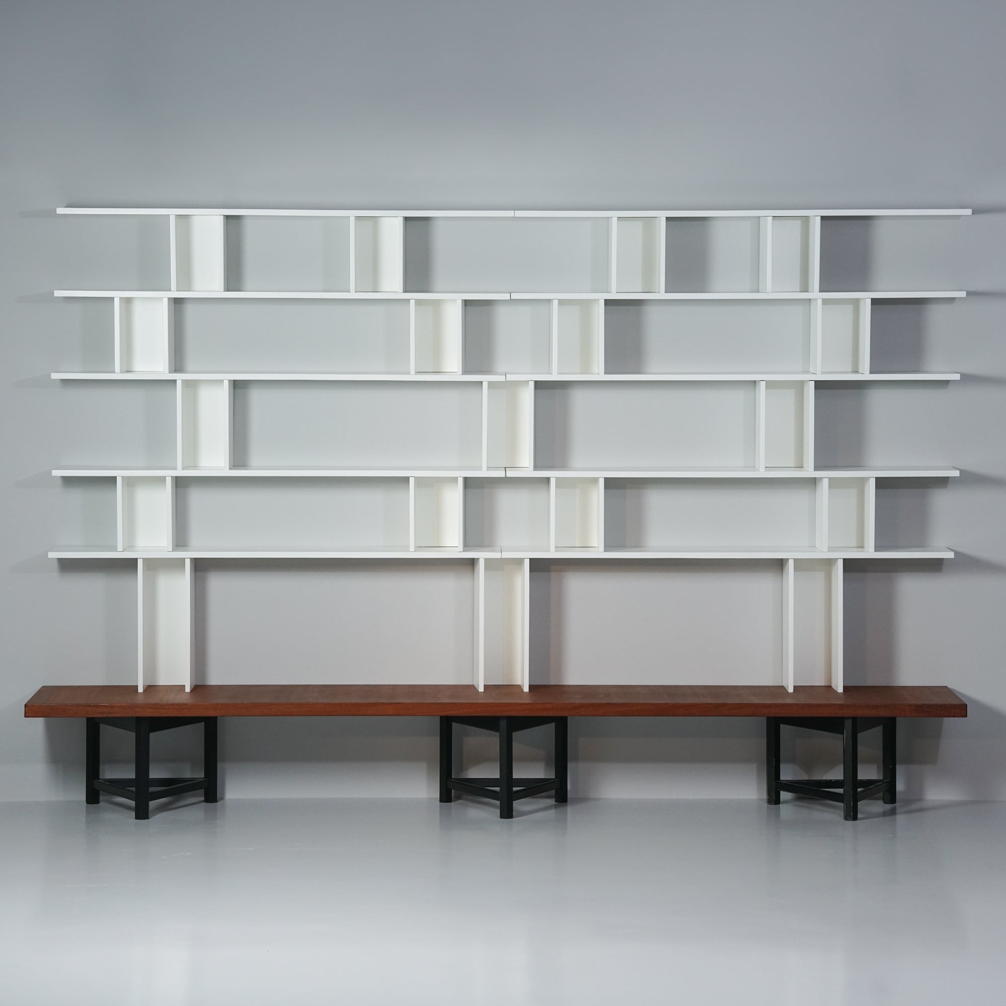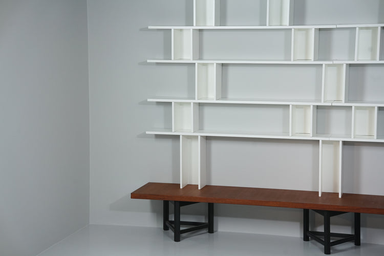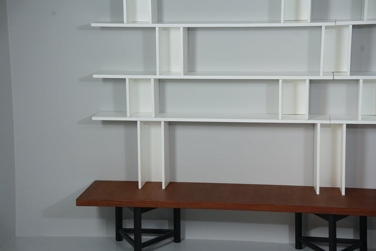 Gorgeous bookshelf/ shelf system model "Välipala", designed by Hiort af Ornäs, manufactured by Huonekaluliike Mikko Nupponen, 1960s. Painted wood and teak. Good vintage condition, patina and minor wear consistent with age and use.