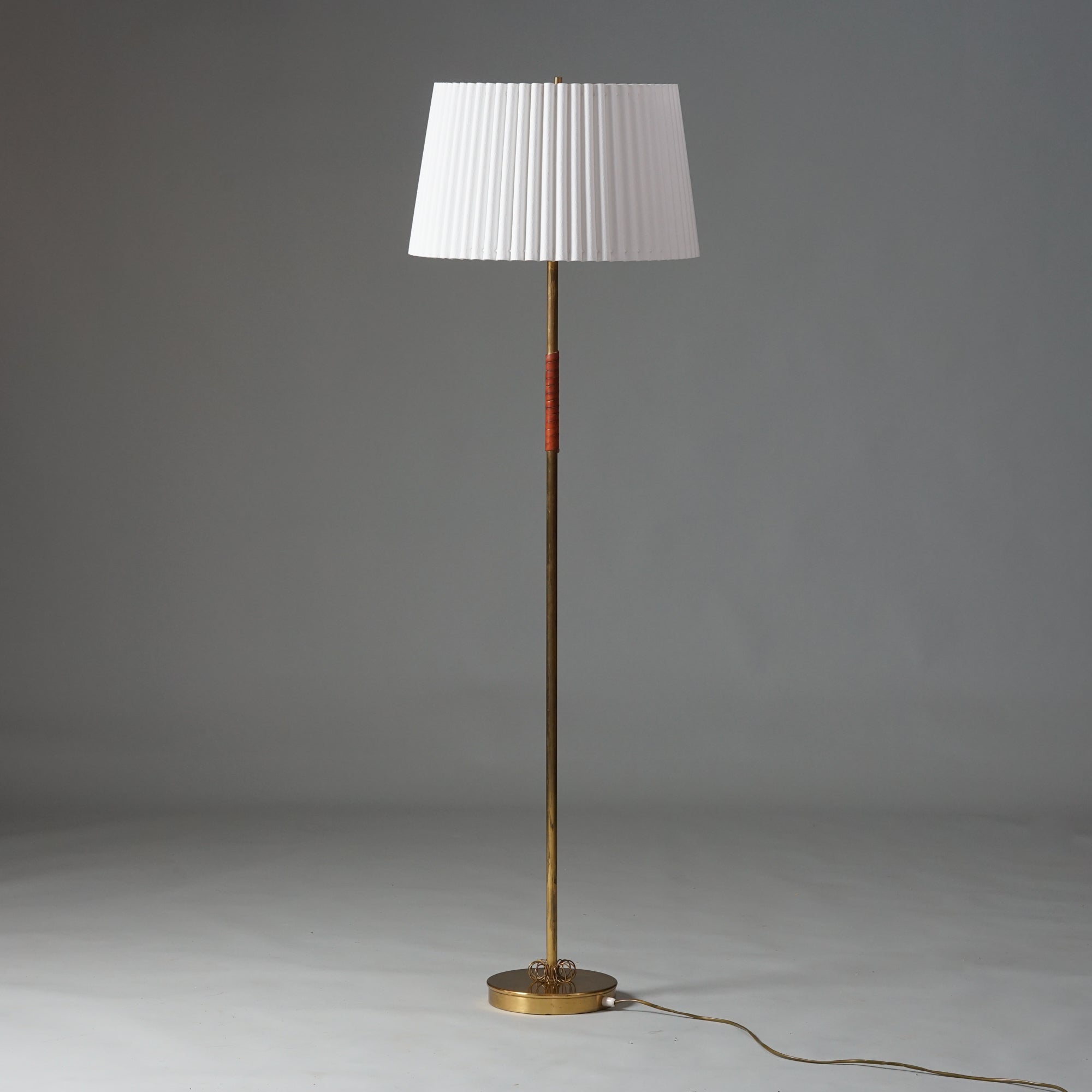Floor light, Finland, 1950s. Brass frame, leather wrapping on the frame, brass details. Renewed fabric shade. Good vintage condition, minor patina consistent with age and use.