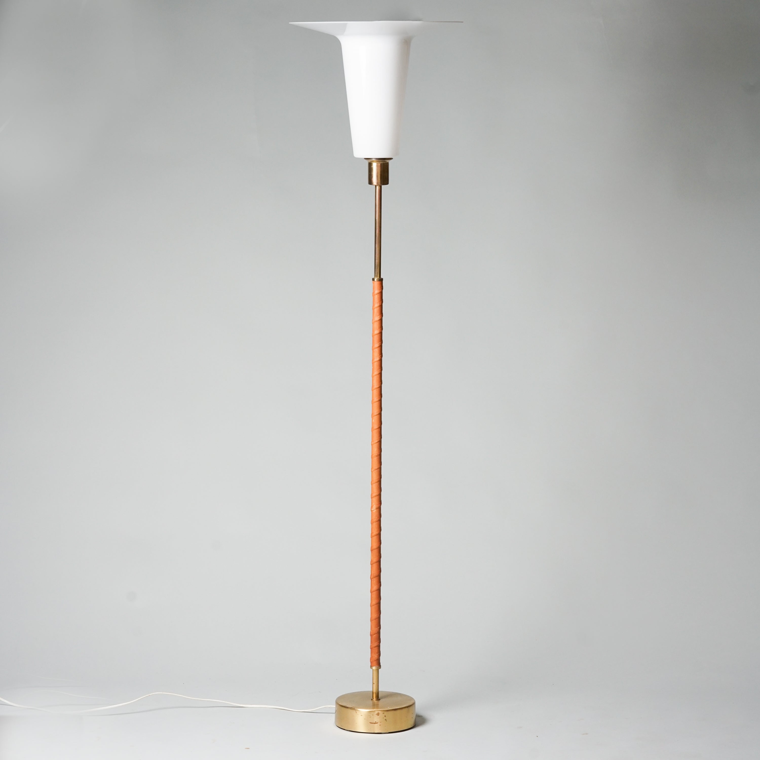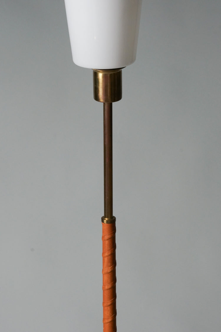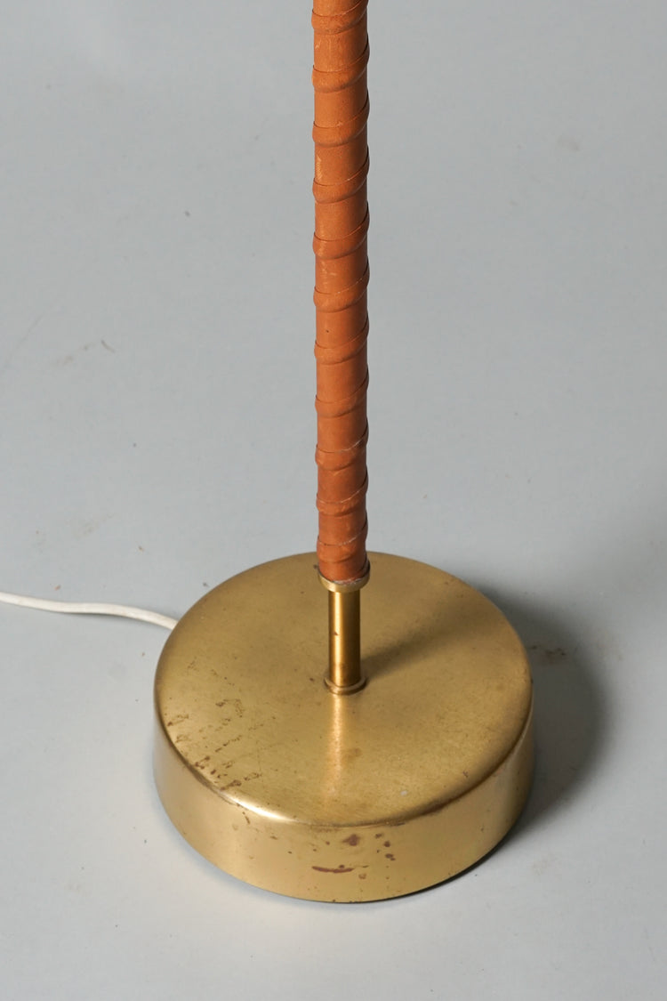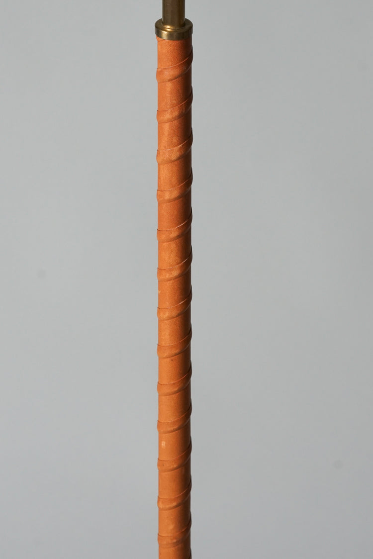 Floor light, manufactured in Sweden, 1960s. Brass frame, leather wrapping, acrylic shade. Good vintage condition, patina consistent with age and use.