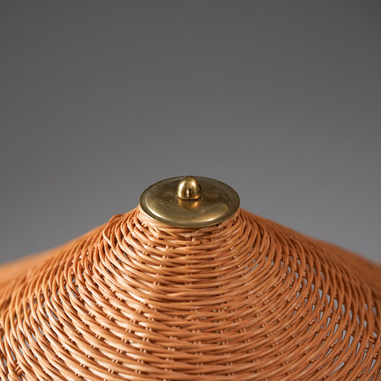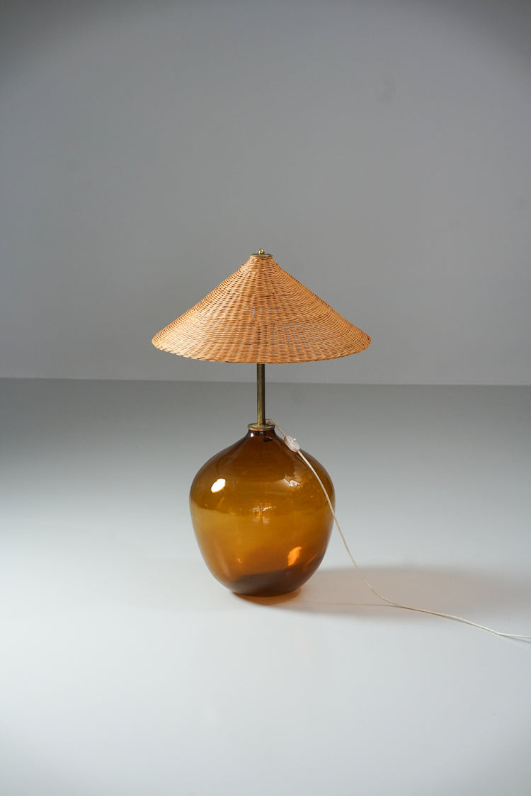 Floor lamp, manufactured in Finland, 1940s. Glass- and brass frame, rattan weaved lampshade. Good vintage condition, patina consistent with age and use.