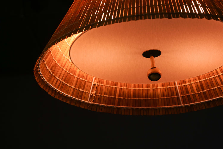 Model A1968 pendant, design Paavo Tynell, manufactured by Taito Oy, Mid-20th Century. Wooden slat shade, brass counterweight, glare protection fabric. Good vintage condition, minor patina consistent with age and use.