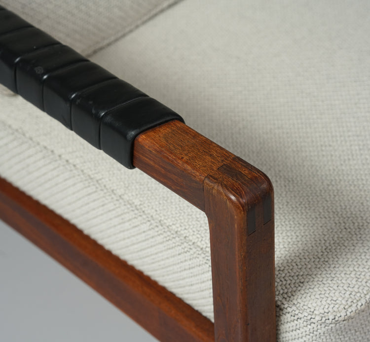 Pair of model Rialto armchairs (2 pieces sold together), designed by Hiort af Ornäs, manufactured by Puunveisto Oy, 1950/1960s. Teak frame, leather wrapping, the leather wrapping on the backrest has been renewed. Seats reupholstered with quality Kvadrat wool fabric. Good vintage condition, patina consistent with age and use.