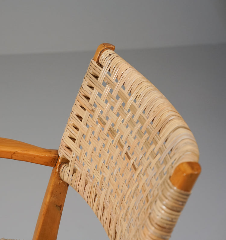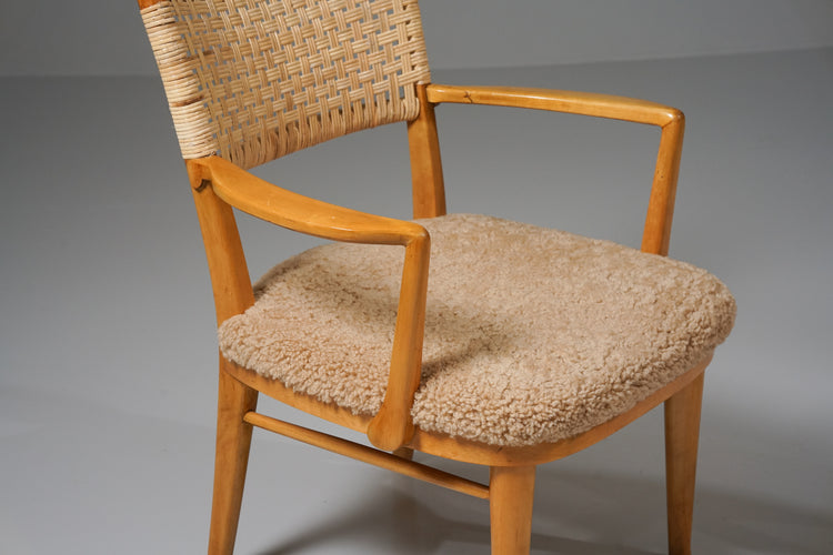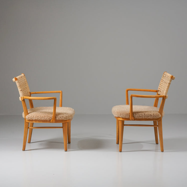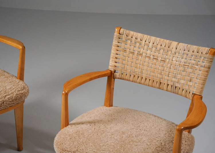 Pair of armchairs, design Arttu Brummer, 1940s. Birch frame with rattan backrest. Shearling upholstery. Good vintage condition, patina consistent with age and use. The chairs are sold as a set. The price indicated is the price for the set.
