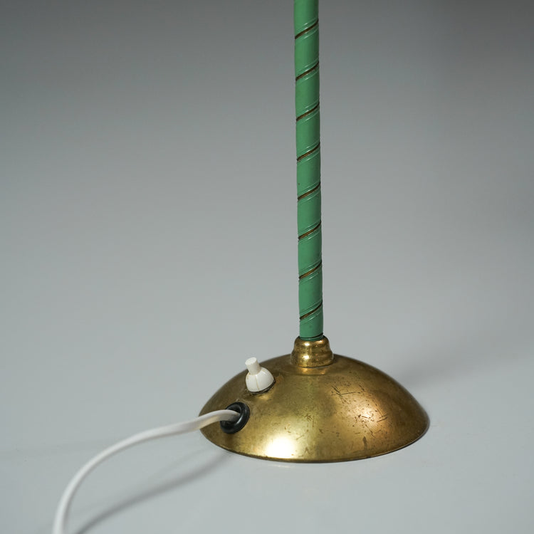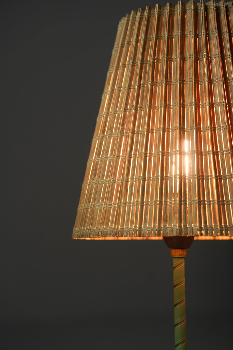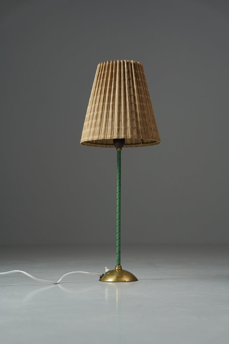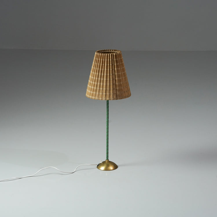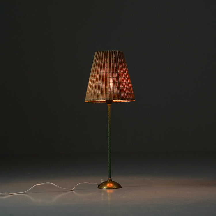 Pöytävalaisin malli 2060, design Lisa Johansson-Pape, valmistanut Orno, 50-luku. Keinonahka punos rungossa, puusäle varjostin, messinki yksityiskohdat. Leimattu. Hyvä kunto, ajan patinaa.