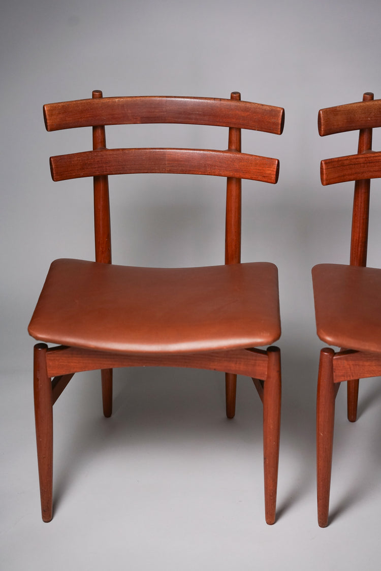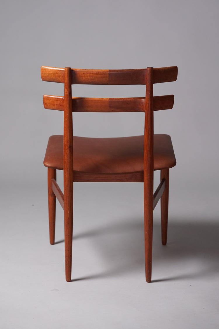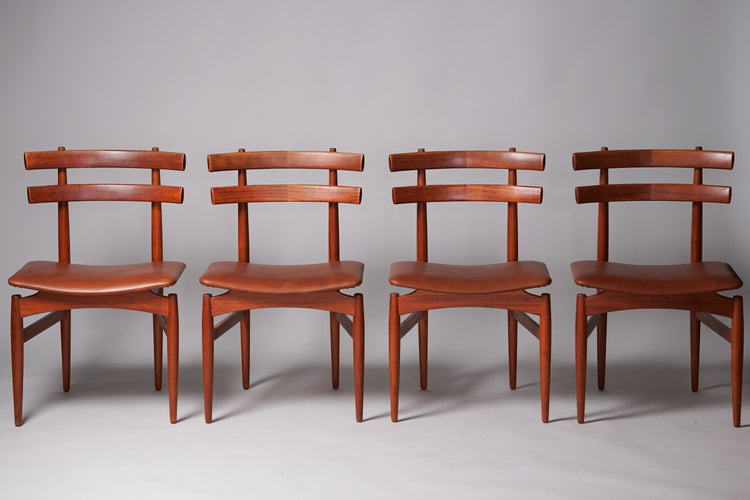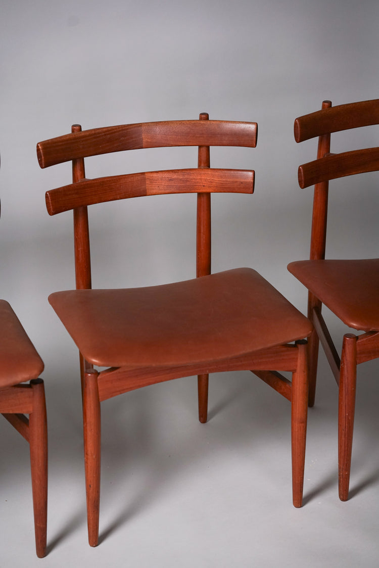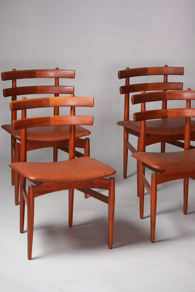 Dining chairs (4 pieces sold together), designed by Poul Hundevad, 1960s, frame solid teak, cognac colored leather seats. Great vintage condition, minor patina consistent with age and use. The chairs are sold as a set.
