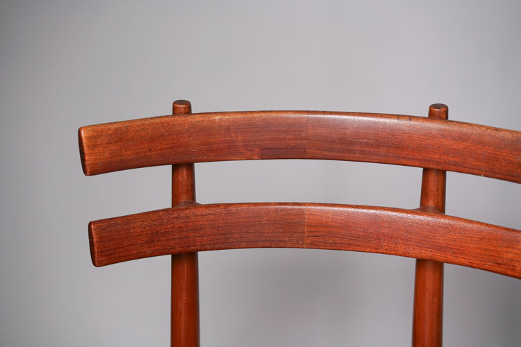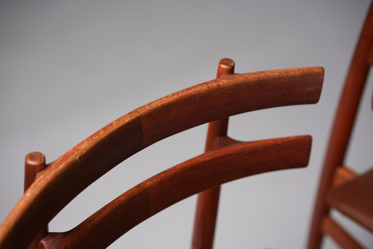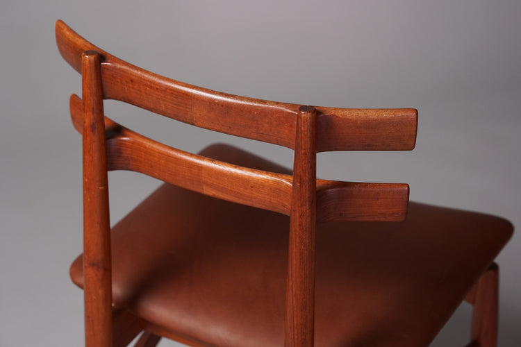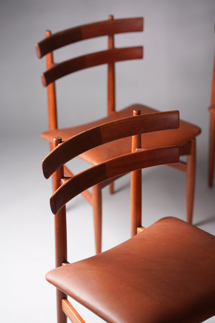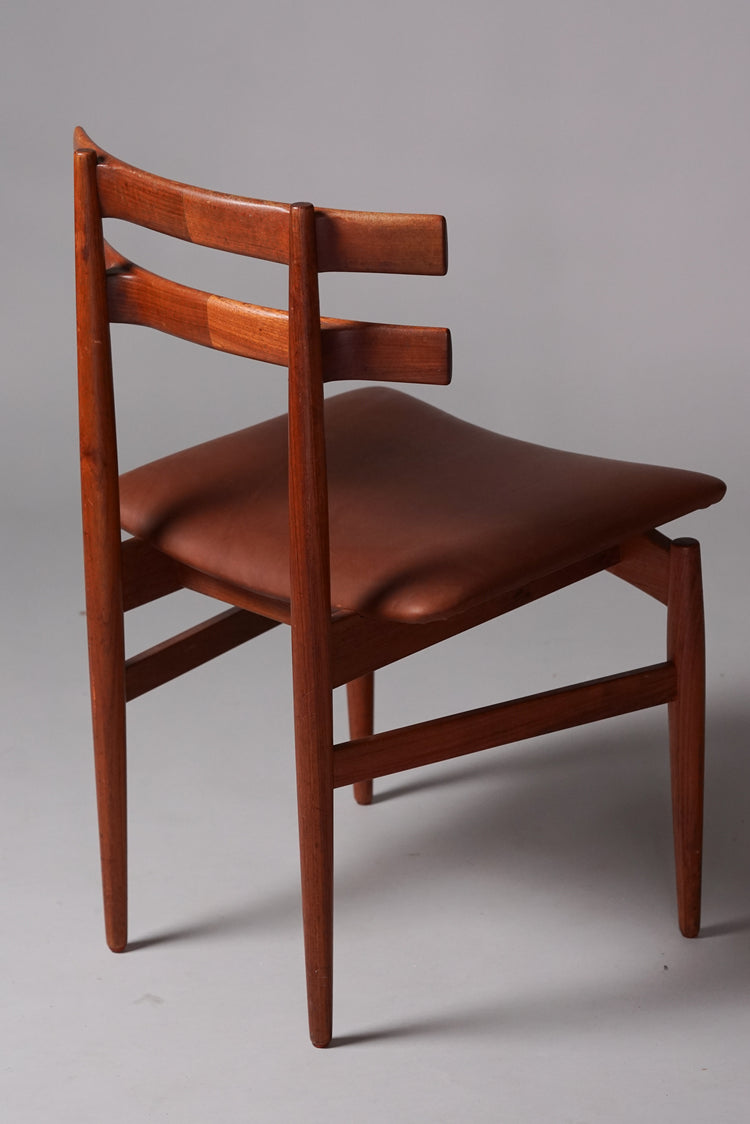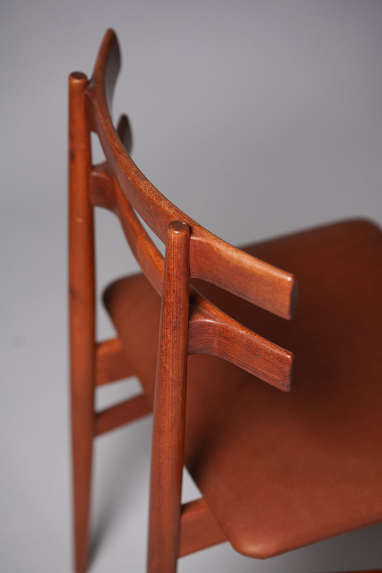 Dining chairs (4 pieces sold together), designed by Poul Hundevad, 1960s, frame solid teak, cognac colored leather seats. Great vintage condition, minor patina consistent with age and use. The chairs are sold as a set.