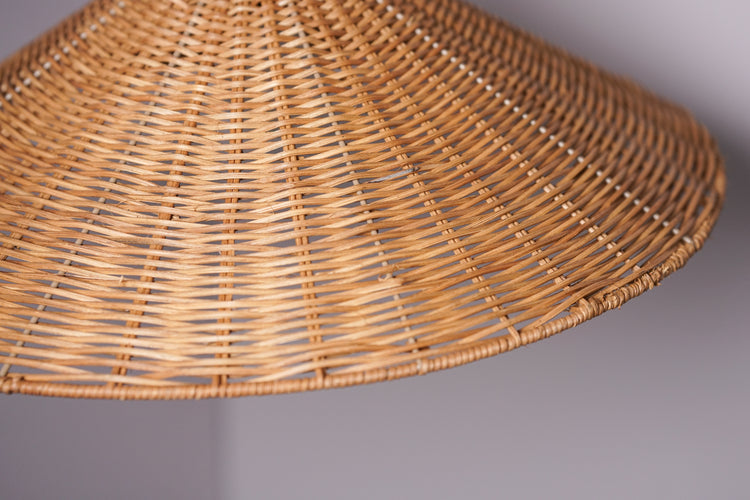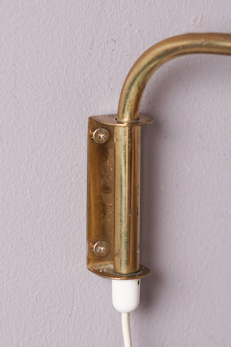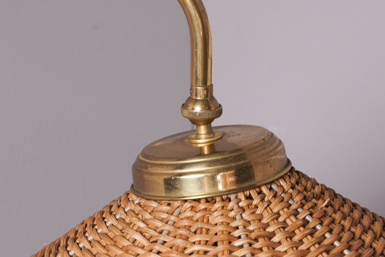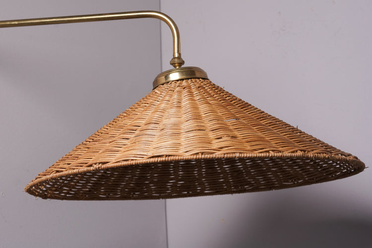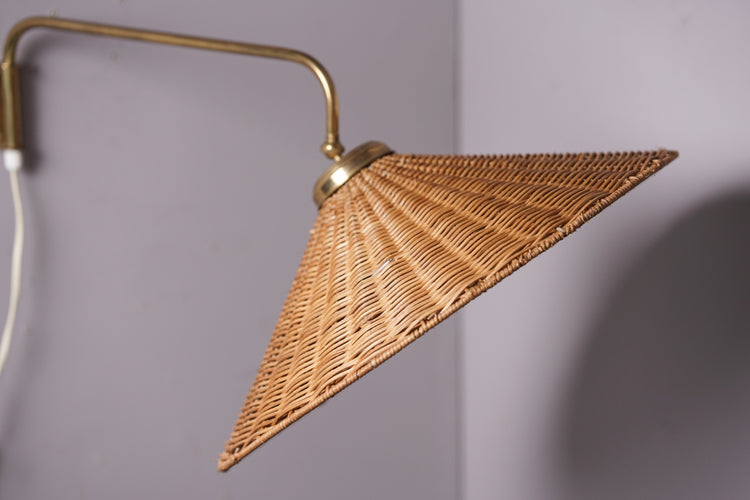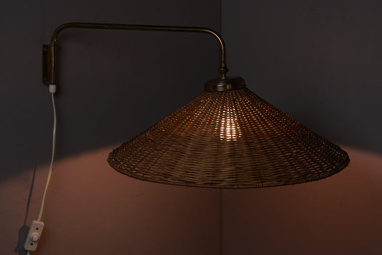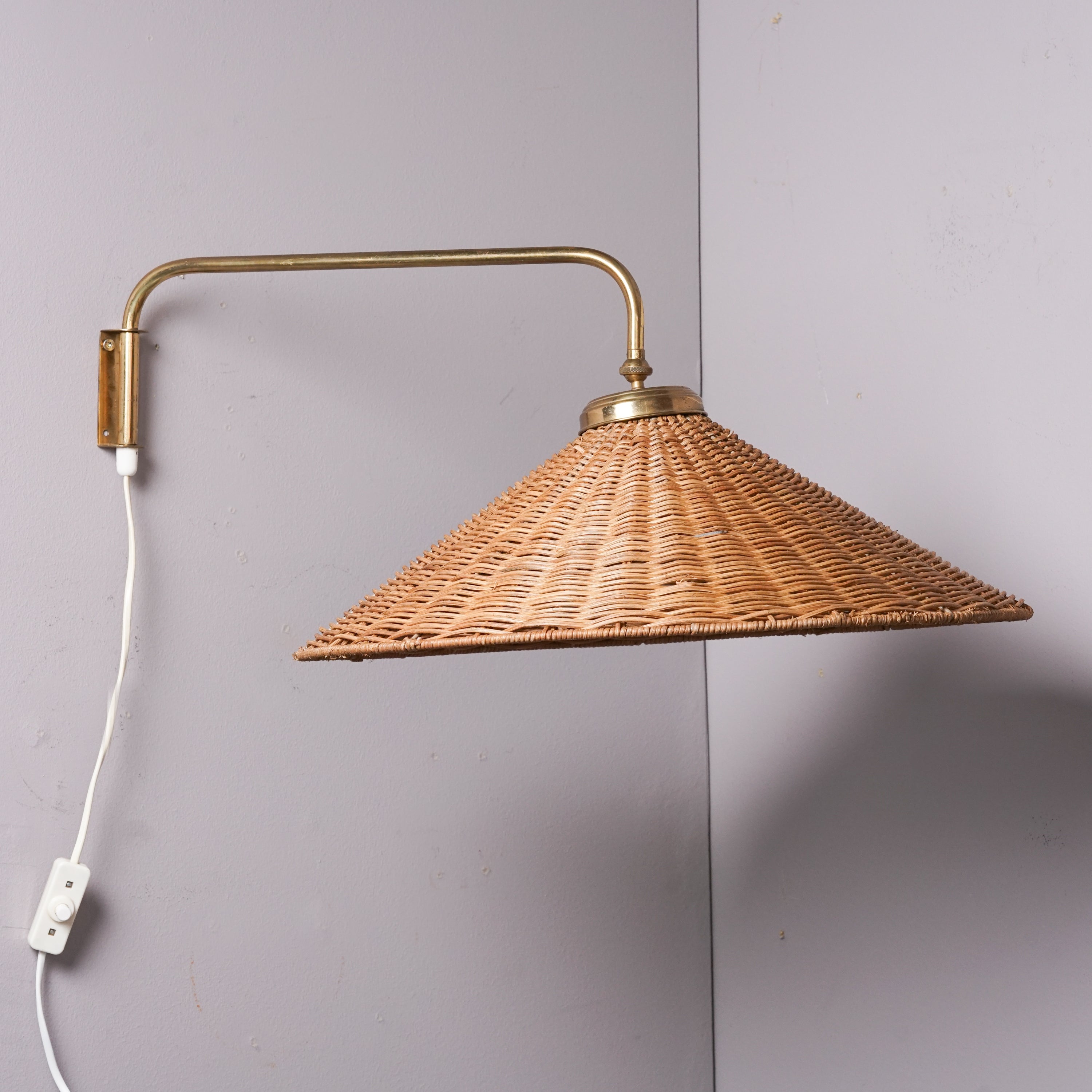 Wall light, manufactured by Itsu, 1950s. Brass frame, weaved shade. Marked. Good vintage condition, minor patina and wear. The frame is reversible.