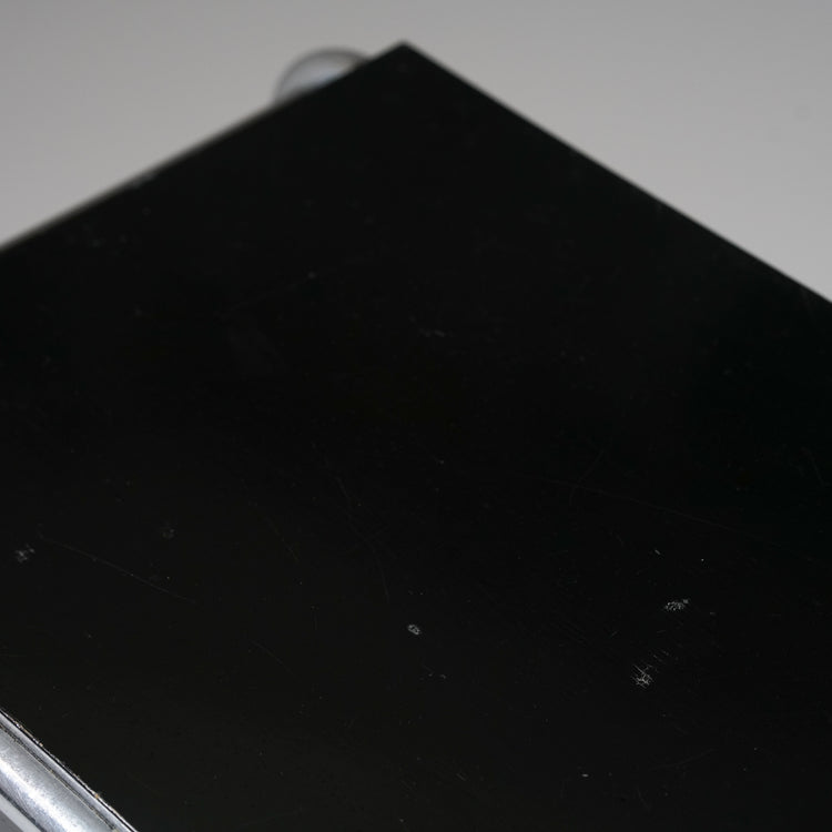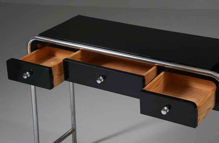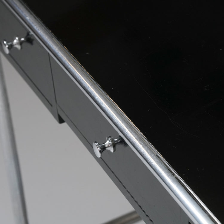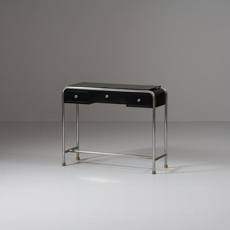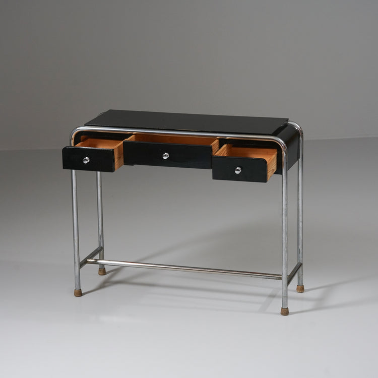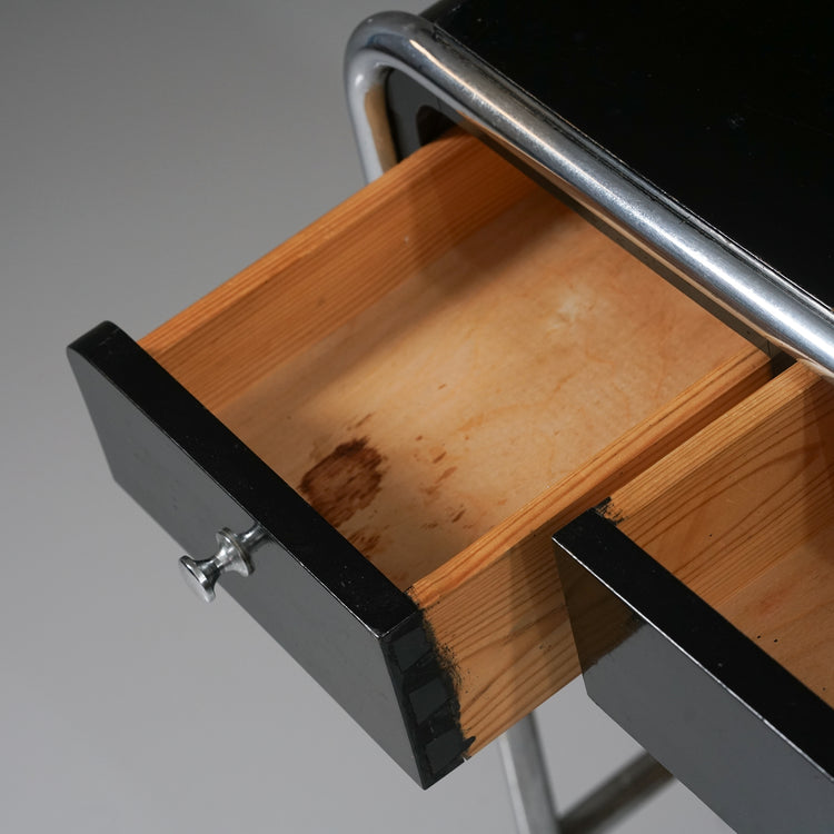Side table, manufactured by Heteka, 1930s. Black painted wood, chromed metal. Good vintage condition, patina and wear consistent with age and use.
