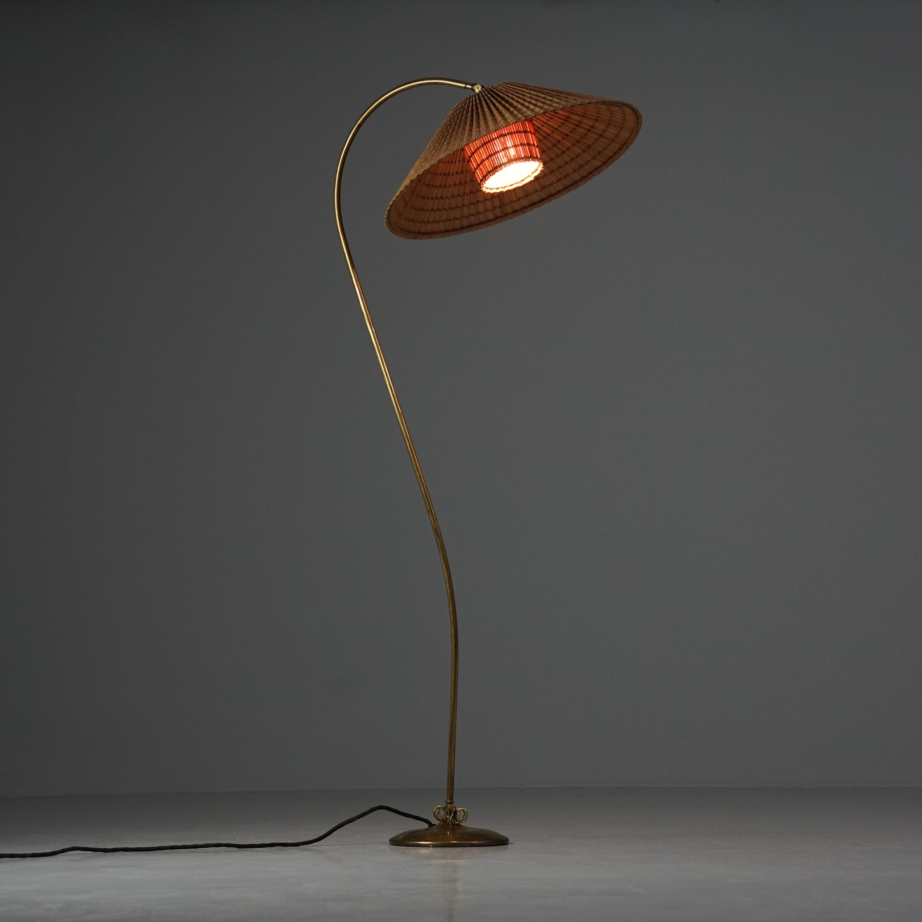 Floor lamp, manufactured by V.Soini, 1940/1950s. Brass frame, gorgeous wooden slat shade. Marked. Good vintage condition, patina consistent iwth age and use.