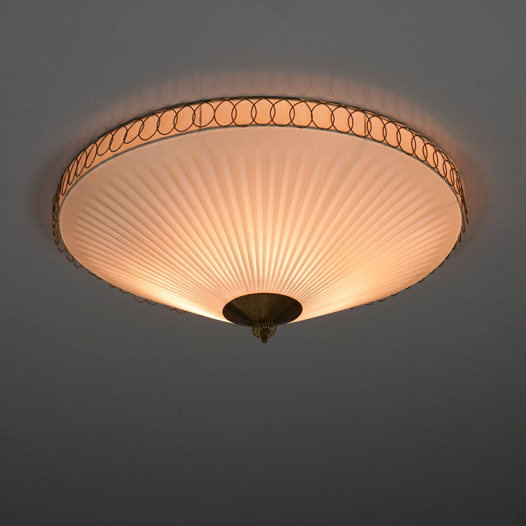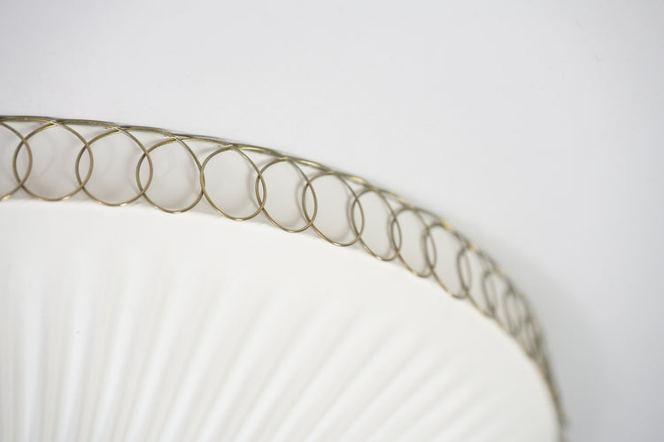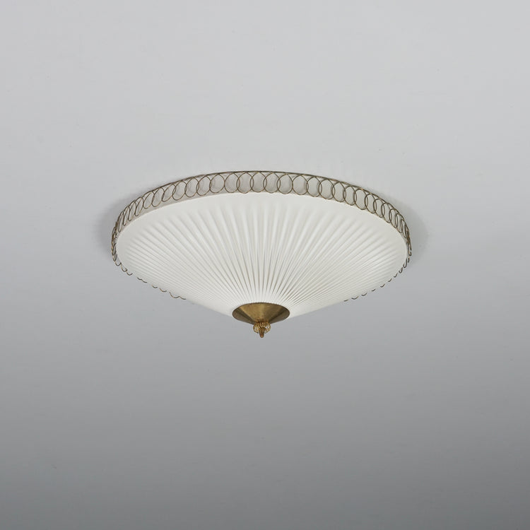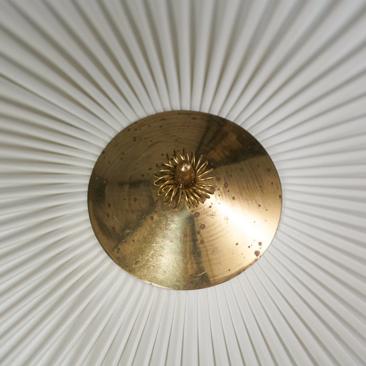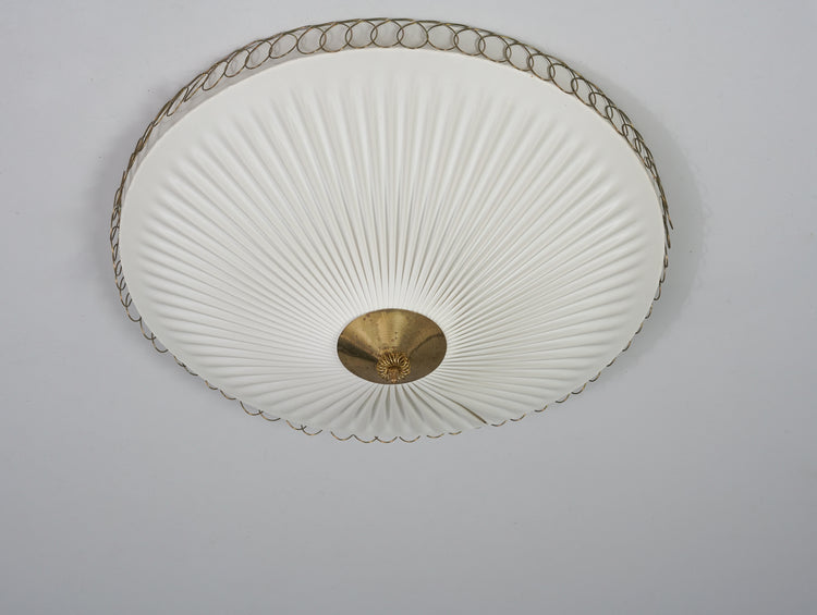 Flush mount, manufactured in Finland, 1950/1960s. Plastic shade, brass details. Good vintage condition, minor patina consistent with age and use.