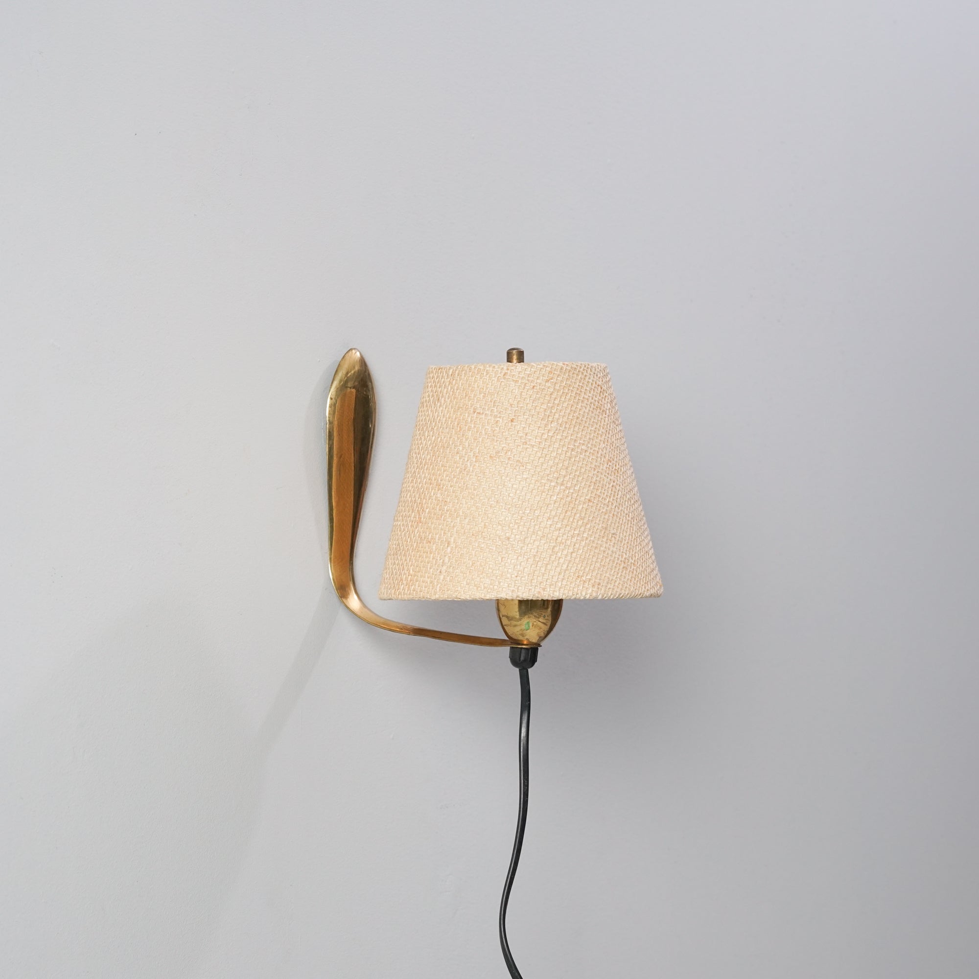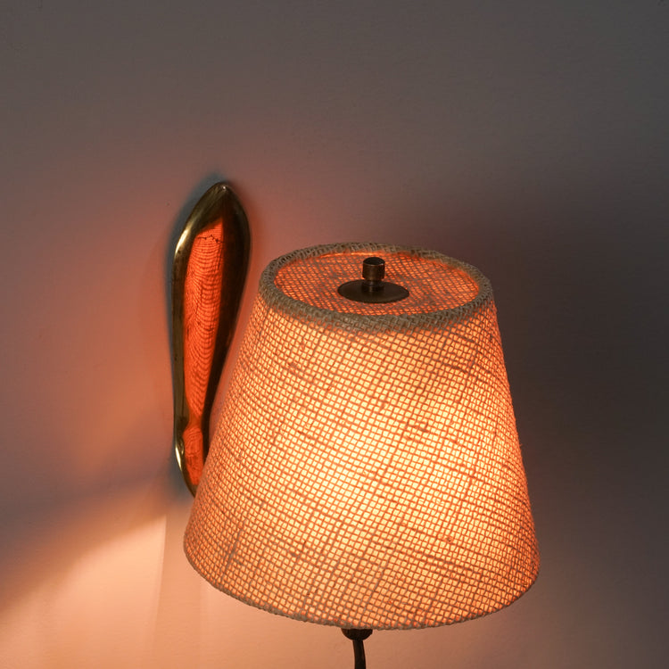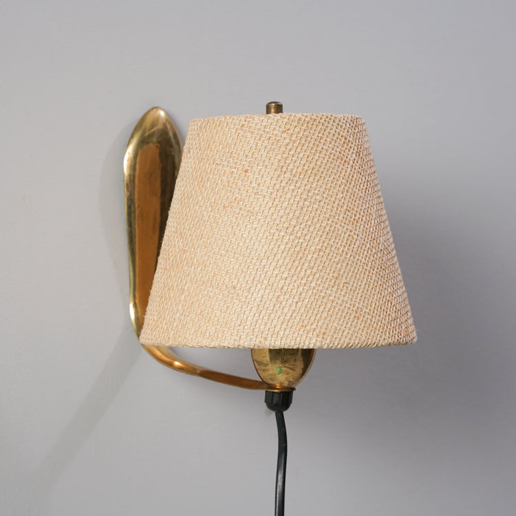 Seinävalaisin, valmistettu Suomessa, 50-luku. Messinkirunko, kangasvarjostin. Hyvä kunto, ajan patinaa.