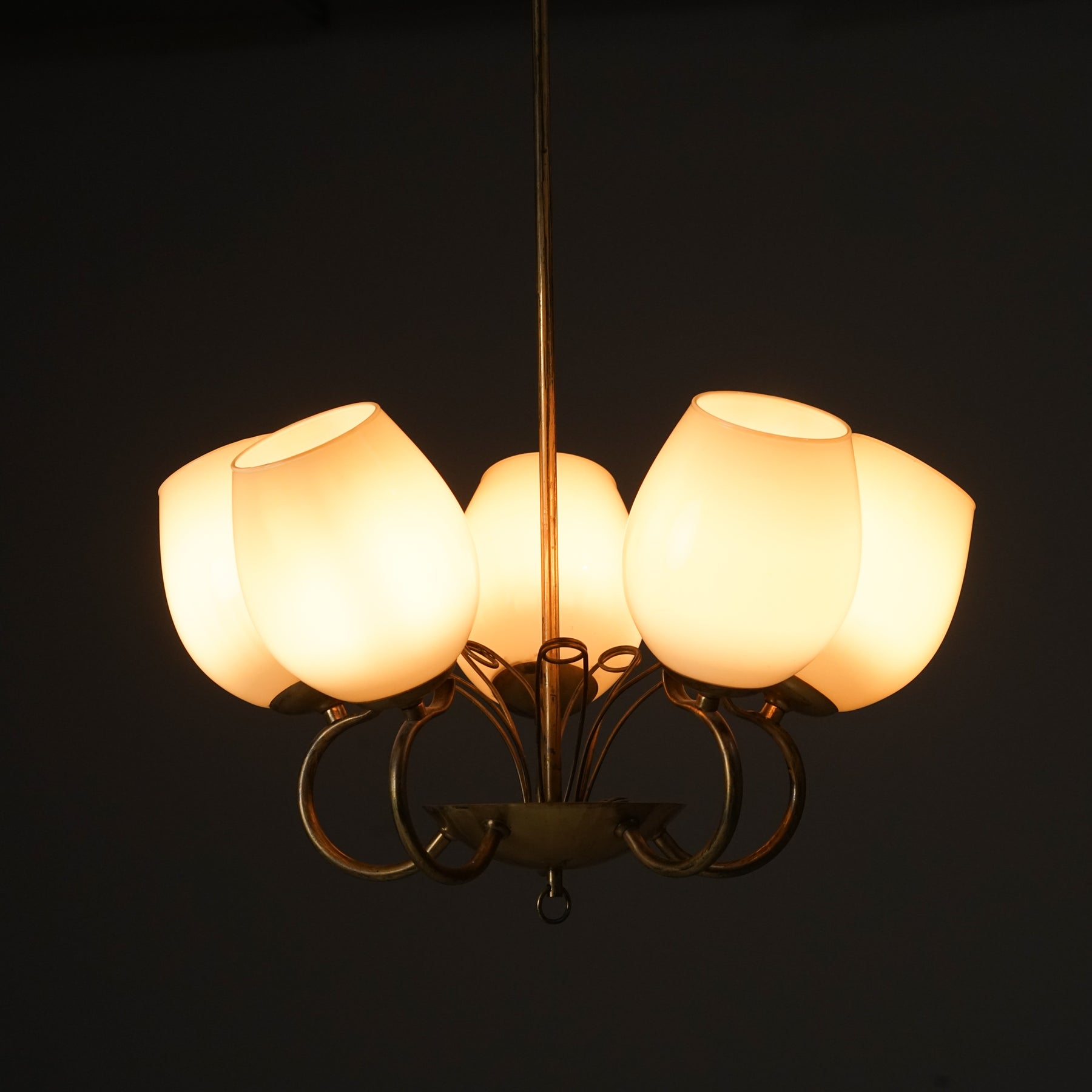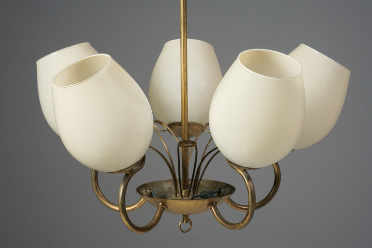 Kattovalaisin malli 50603, valmistanut Idman, 50-luku. Runko messinkiä, opaali lasikuvut. Hyvä kunto, ajan patinaa.