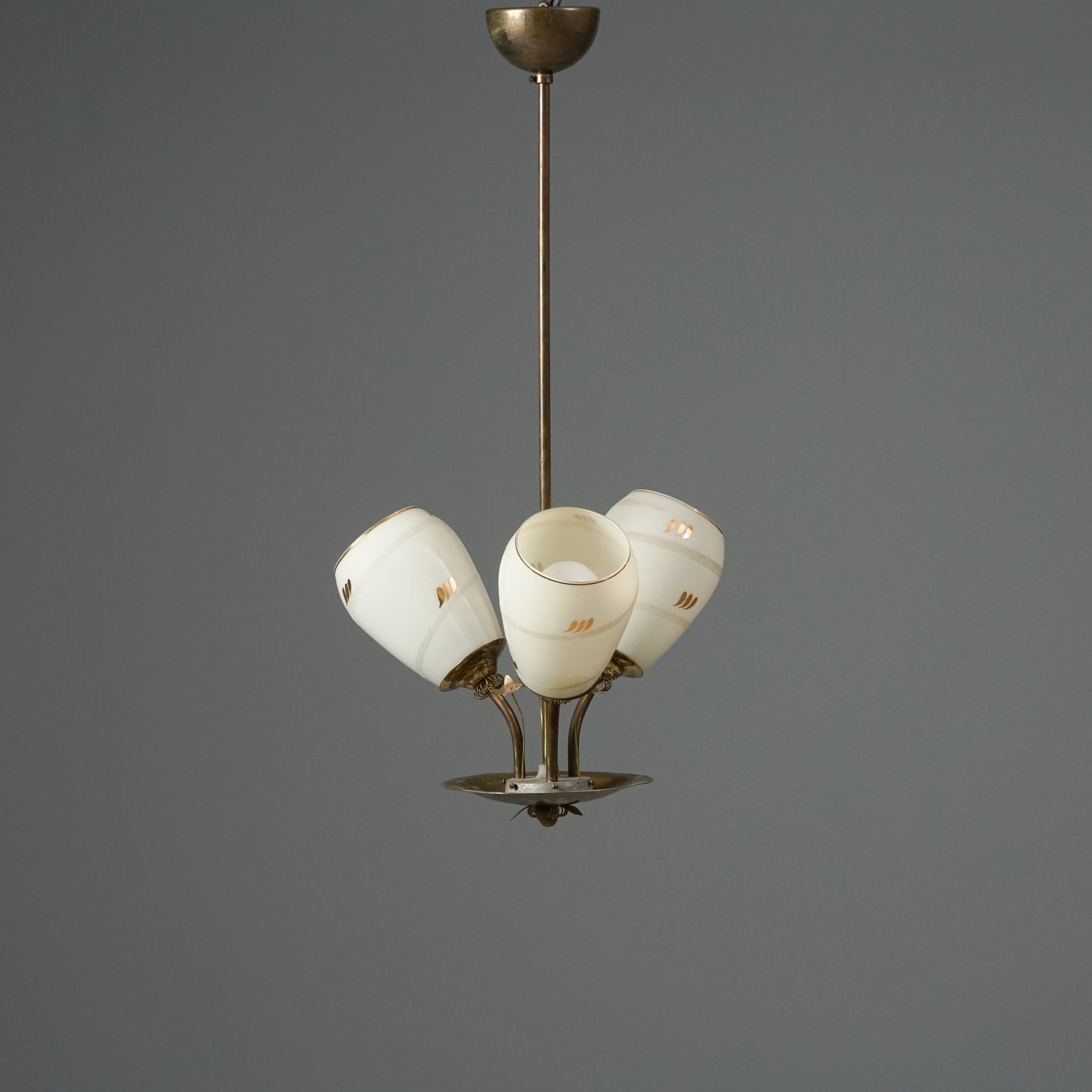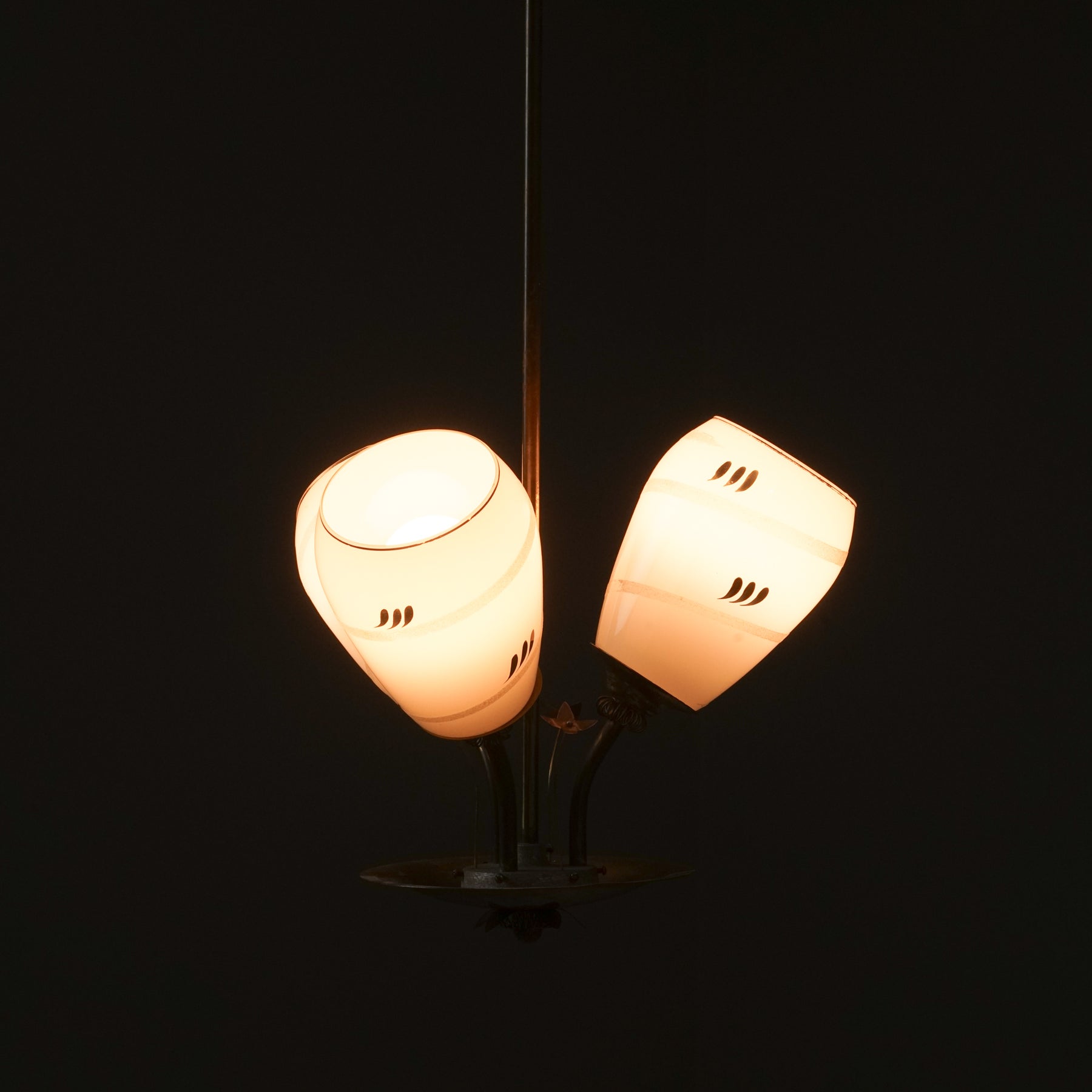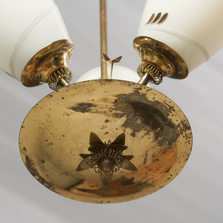 Kattovalaisin, valmistettu Suomessa, 50-luku. Messinki runko, opaali lasikuvut. Hyvä kunto, ajan patinaa.