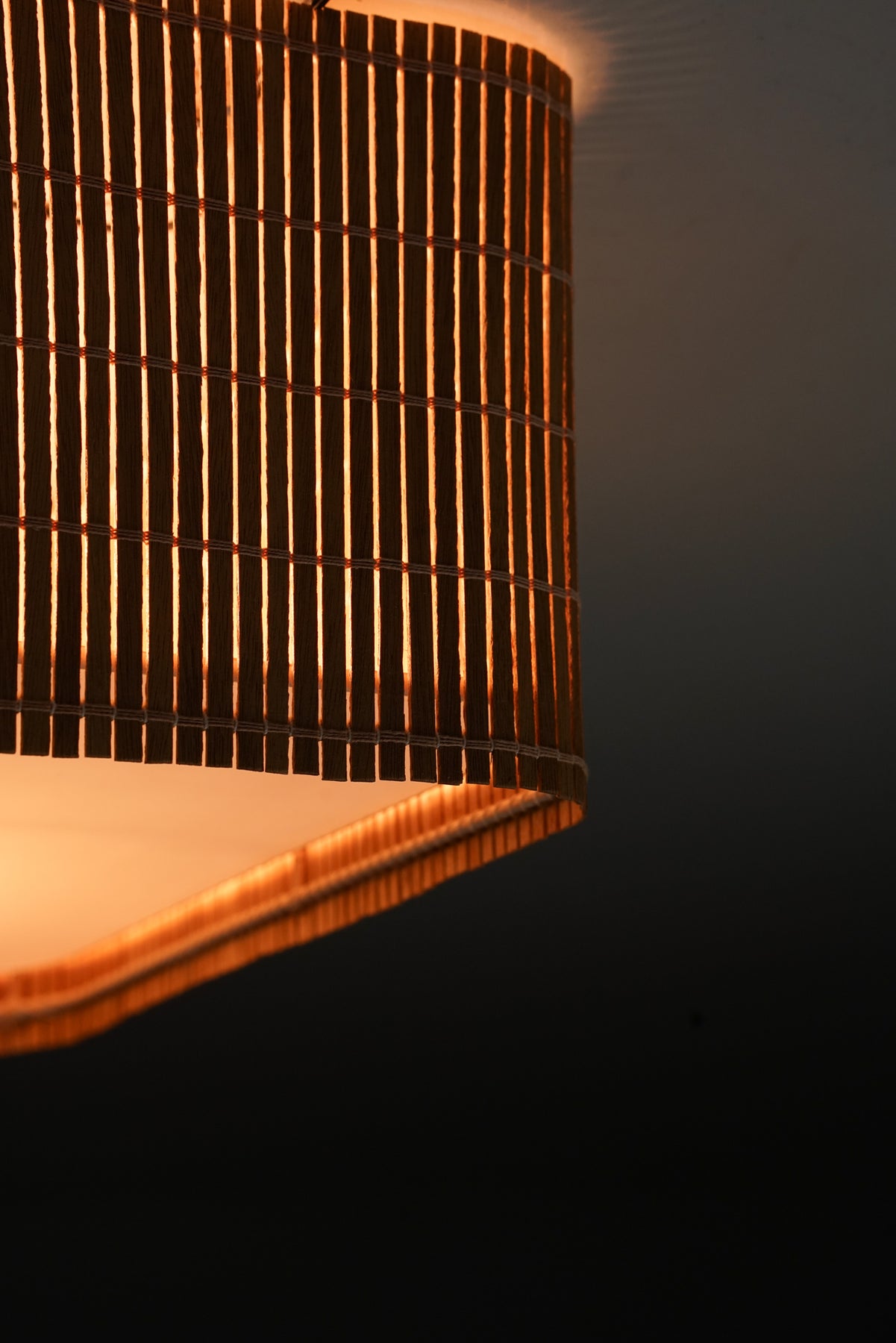 Model 20428 flush mount, design Paavo Tynell, manufactured by Idman, 1940s. Wooden slat and fabric frame, brass detail. Marked. Good vintage condition, minor patina consistent with age and use.