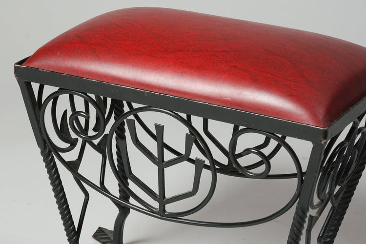 Rare iron stools, manufactured by Taidetakomo Hakkarainen, Early 20th Century, imitation leather seats, good vintage condition, patina consistent with age and use.